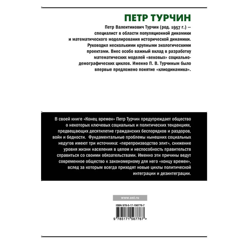 Конец времен. Петр Валентинович Турчин (род. 1957 г.) - специалист в области популяционной динамики и математического моделирования исторической динамики. Руководил несколькими крупными экологическими проектами. Внес особо важный вклад в разработку математических моделей "вековых" социально-демографических циклов. Именно П. В. Турчиным было впервые предложено понятие "клиодинамика". В своей книге "Конец времен" Петр Турчин предупреждает общество о некоторых ключевых социальных и политических тенденциях, предвещающих десятилетие гражданских беспорядков и раздоров, войн и бедности. Фундаментальные проблемы нынешних социальных недугов имеют три источника: "перепроизводство элит", снижение уровня жизни населения в целом и неспособность правительств справиться со своими обязательствами. Именно эти причины ведут современное общество к закономерному для него "концу времен", вслед за которым всегда приходят новые циклы политической интеграции и дезинтеграции.