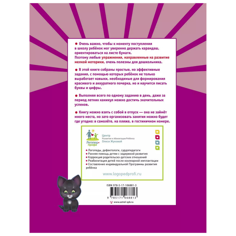 К моменту поступления в школу ребенок должен уметь правильно держать карандаш или ручку, ориентироваться на листе бумаги. Поэтому любые упражнения, направленные на развитие мелкой моторики, очень полезны для дошкольника. Выполняя задания, собранные в этой книге, ребенок будет обводить и раскрашивать, научится писать буквы и цифры все это крайне важно для формирования красивого и аккуратного почерка. Для дошкольного возраста.