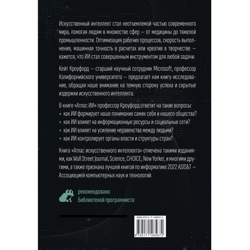 Атлас искусственного интеллекта: руководство для будущего. Искусственный интеллект стал неотъемлемой частью современного мира, помогая людям в множестве сфер - от медицины до тяжелой промышленности. Оптимизация рабочих процессов, скорость выполнения, машинная точность в расчетах или креатив в творчестве - кажется, что ИИ стал совершенным инструментом для любой задачи. Кейт Кроуфорд - старший научный сотрудник Microsoft, профессор Калифорнийского университета - предлагает нам книгу-исследование, обращая наше внимание на темную сторону успеха и скрытые издержки искусственного интеллекта. В книге "Атлас ИИ" профессор Кроуфорд ответит на такие вопросы: - как ИИ формирует наше понимание самих себя и нашего общества? - как ИИ влияет на информационные ресурсы и социальные сети? - как ИИ влияет на усиление неравенства между людьми? - как ИИ контролирует органы власти и структуры стран? Книга "Атлас искусственного интеллекта" отмечена такими изданиями как Wall Street Journal, Science, CHOICE, New Yorker и многими другими, а также признана лучшей книгой по информатике 2022 ASI