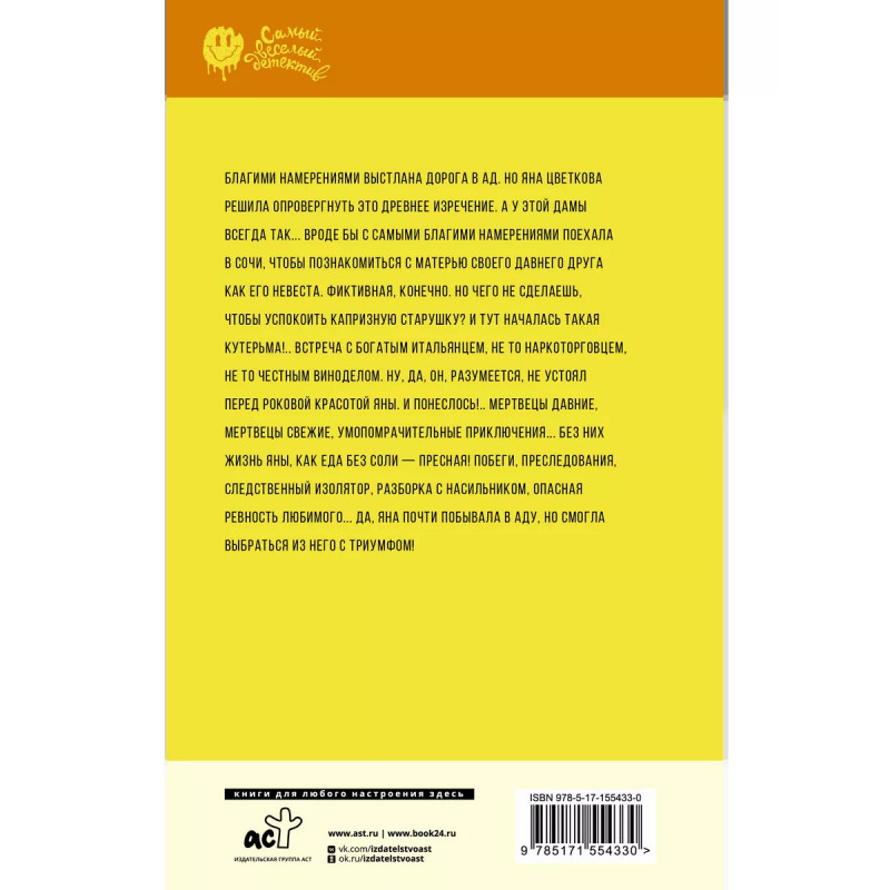 Благими намерениями выстлана дорога в ад. Но Яна Цветкова решила опровергнуть это древнее изречение. А у этой дамы всегда так... Вроде бы с самыми благими намерениями поехала в Сочи, чтобы познакомиться с матерью своего давнего друга как его невеста. Фиктивная, конечно. Но чего не сделаешь, чтобы успокоить капризную старушку? И тут началась такая кутерьма!.. Встреча с богатым итальянцем, не то наркоторговцем, не то честным виноделом. Ну, да, он, разумеется, не устоял перед роковой красотой Яны. И понеслось!.. Мертвецы давние, мертвецы свежие, умопомрачительные приключения... Без них жизнь Яны, как еда без соли пресная! Побеги, преследования, следственный изолятор, разборка с насильником, опасная ревность любимого... Да, Яна почти побывала в аду, но смогла выбраться из него с триумфом!