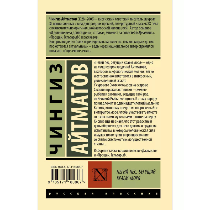"Пегий пес, бегущий краем моря" одно из лучших произведений Айтматова, в котором мифологические мотивы легко и естественно вплетаются в интересный, увлекательный сюжет. У сурового Охотского моря на острове Сахалин проживают нивхи смелые рыбаки и охотники, ведущие свой род от Великой Рыбы-женщины. К этому народу принадлежит и одиннадцатилетний мальчик Кириск, которому предстоит впервые выйти в открытое море, чтобы участвовать вместе со взрослыми мужчинами в охоте на нерпу. Кириск еще не знает, что этот радостный день обернется для него долгим и трудным испытанием, в котором человеческая сила и мужество вступят в противостояние со слепой жестокостью могущественной стихии В сборник также вошли повести "Джамиля" и "Прощай, Гульсары!".