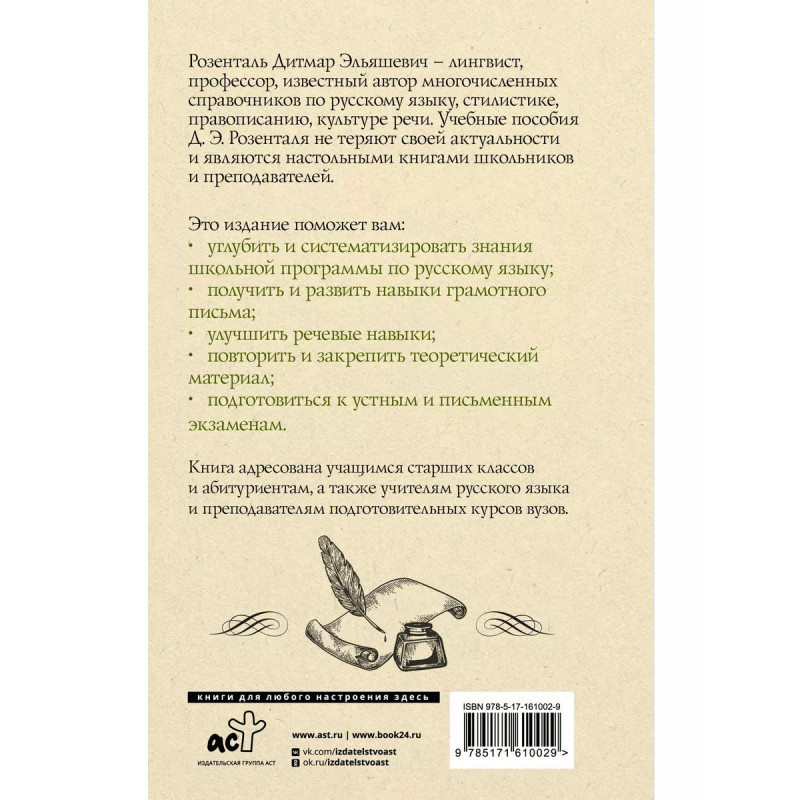 Розенталь Дитмар Эльяшевич лингвист, профессор, известный автор многочисленных справочников по русскому языку, стилистике, правописанию, культуре речи. Учебные пособия и справочники Д. Э. Розенталя не теряют своей актуальности и являются настольными книгами школьников и преподавателей. Издание содержит теоретические сведения по орфографии и морфологии, синтаксису и пунктуации, а также более 200 тренировочных упражнений. Благодаря работе с этим пособием учащиеся смогут не только повторить школьную программу, но и подготовиться к выпускным и вступительным экзаменам по русскому языку, особенно к ОГЭ и ЕГЭ. Книга адресована учащимся старших классов и абитуриентам, а также учителям русского языка и преподавателям подготовительных курсов вузов.