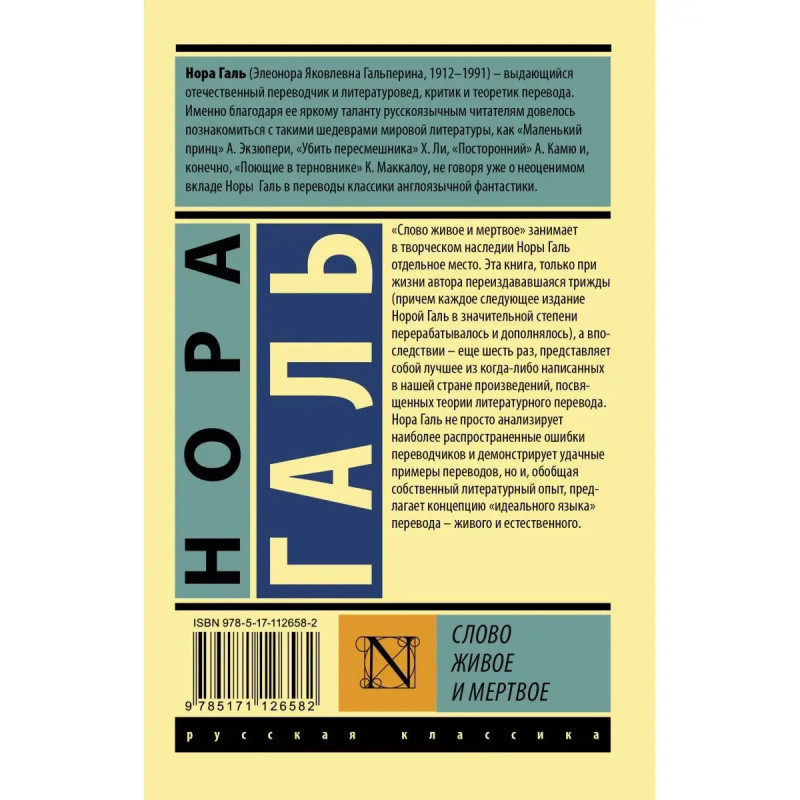 "Слово живое и мертвое" занимает в творческом наследии Норы Галь отдельное место. Эта книга, только при жизни автора переиздававшаяся трижды (причем каждое следующее издание Норой Галь в значительной степени перерабатывалось и дополнялось), а впоследствии еще шесть раз, представляет собой лучшее из когда-либо написанных в нашей стране произведений, посвященных теории литературного перевода. Нора Галь не просто анализирует наиболее распространенные ошибки переводчиков и демонстрирует удачные примеры переводов, но и, обобщая собственный литературный опыт, предлагает концепцию "идеального языка" перевода живого и естественного.