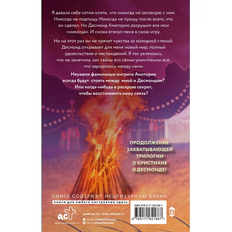 Читайте хит продаж российского Young Adult! Я клялась себе, что больше никогда не заговорю с ним. Не прощу и не позволю себя обмануть. Но Десмонд Аматорио снова меня переиграл. Я потеряла голову и не заметила, как тайны его семьи уничтожили нашу хрупкую связь. Неужели прошлое семьи Аматорио всегда будет стоять между нами? И что, если я сама раскрою тщательно оберегаемый фамильный секрет?