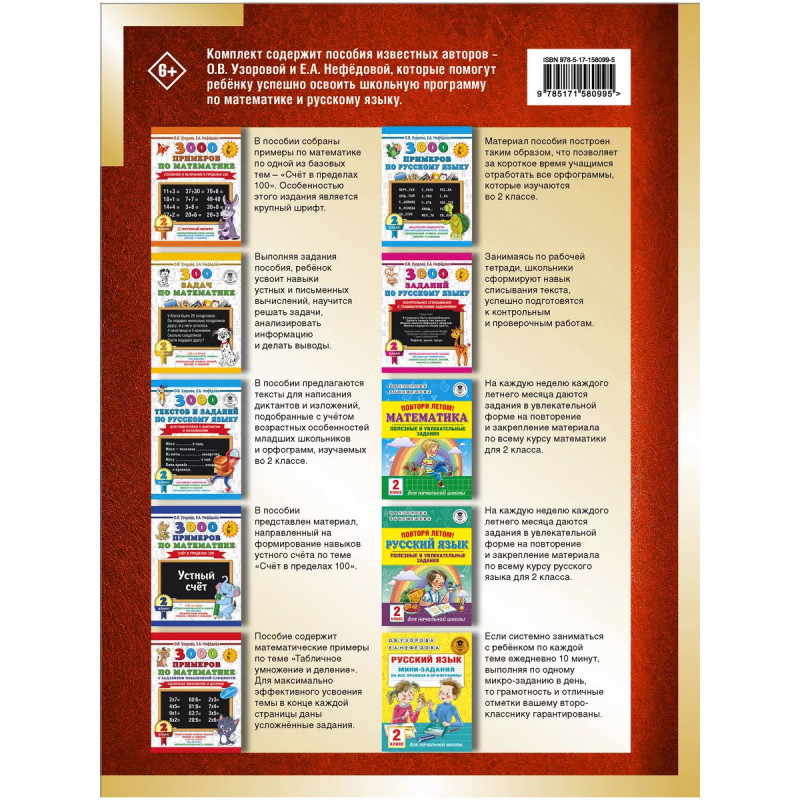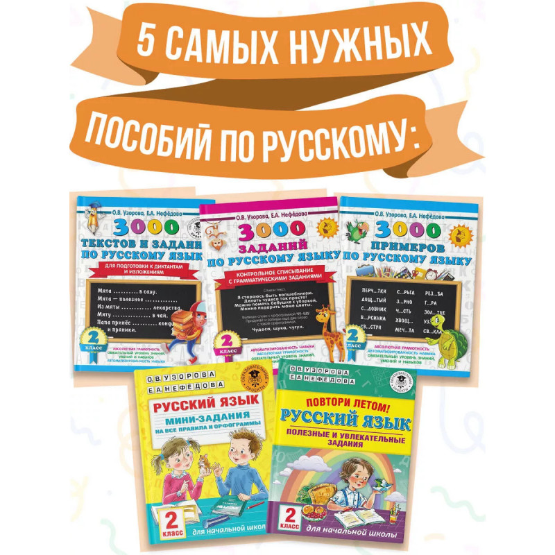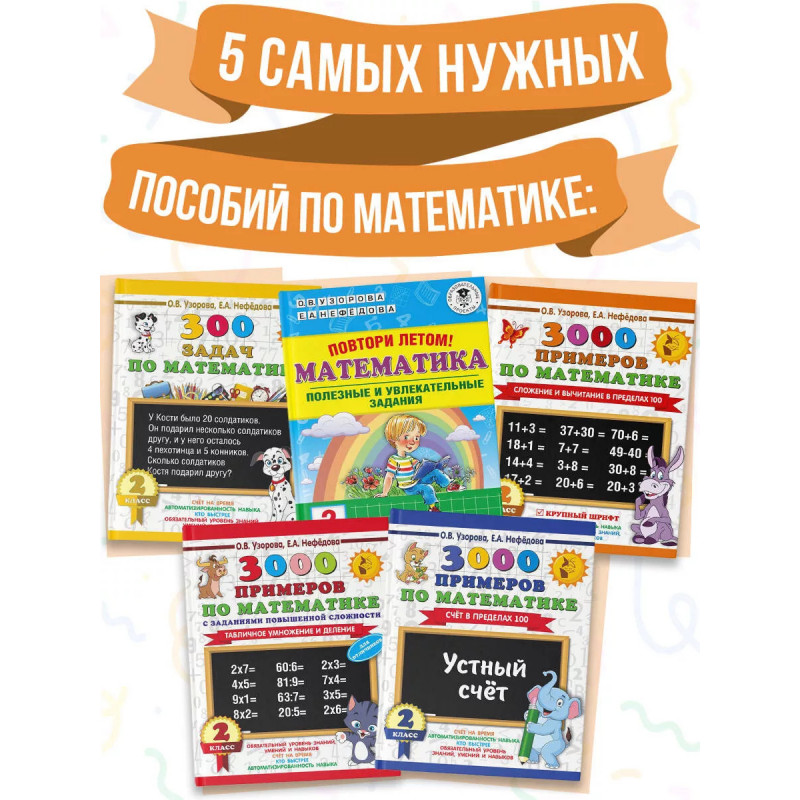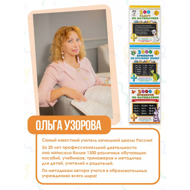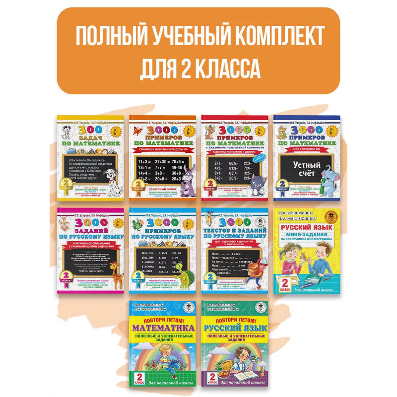 Все, что поможет ребенку стать успешным в учёбе, вы найдёте в книгах Узоровой и Нефёдовой: тексты для 2 класса, контрольное списывание, диктанты по русскому языку, подготовка к диктантам, задания по русскому языку, тесты по русскому языку, примеры по математике, сложение, вычитание, задания по математике, задачи по математике, контрольная работа, самостоятельная работа, проверочные работы, тесты по математике, математические диктанты, устный счёт, счёт в пределах 100, справочное пособие, рабочая тетрадь, комплект рабочих тетрадей, решаем примеры, решаем задачи, тренинг, разные виды сложности, сборники заданий, комплексные работы, летние задания, 2 класс, возраст 7-8 лет.