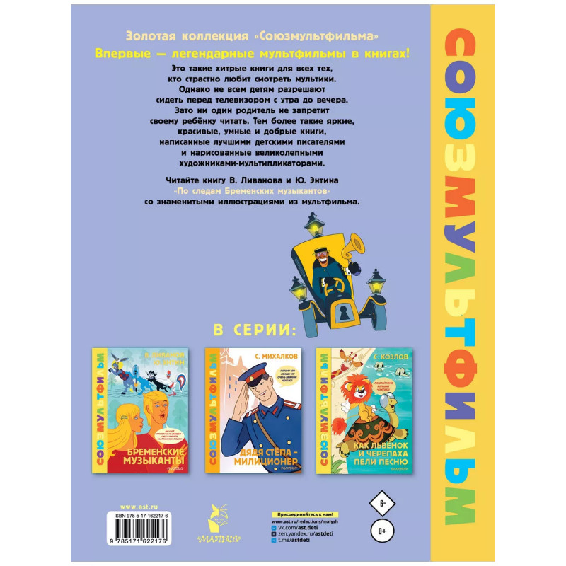 Золотая коллекция Союзмультфильма Впервые легендарные мультфильмы в книгах! Это такие хитрые книги для всех тех, кто страстно любит смотреть мультики. Однако не всем детям разрешают сидеть перед телевизором с утра до вечера. Зато ни один родитель не запретит своему ребёнку читать. Тем более такие яркие, красивые, умные и добрые книги, написанные лучшими детскими писателями и нарисованные великолепными художниками-мультипликаторами. Читайте книгу В. Ливанова и Ю. Энтина По следам Бременских музыкантов со знаменитыми иллюстрациями из мультфильма.