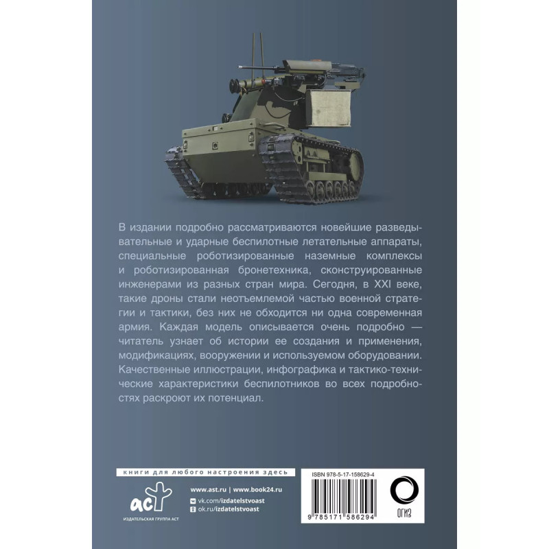 Современная беспилотная техника. Эта книга - всесторонний обзор самой современной беспилотной техники, нашедшей применение как на полях сражений, так и в мирной жизни. Однако специфика этих удивительных инновационных аппаратов предполагает их широкое использование в первую очередь в военной сфере, ведь, как известно, любые технические новации внедряются и апробируются на поле боя, и одна из основных задач таких машин - минимизировать человеческие потери. В издании подробно рассматриваются новейшие разведывательные и ударные беспилотные летательные аппараты, специальные роботизированные наземные комплексы и роботизированная бронетехника, сконструированные инженерами из разных стран мира. Сегодня, в XXI веке, такие дроны стали неотъемлемой частью военной стратегии и тактики, без них не обходится ни одна современная армия. Каждая модель описывается очень подробно - читатель узнает об истории ее создания и применения, модификациях, вооружении и используемом оборудовании. Качественные иллюстрации, инфографика и тактико-технические характеристики