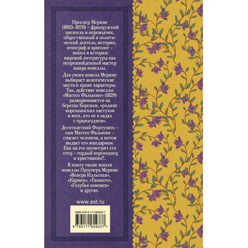 Проспер Мериме (1803-1870) - французский писатель и переводчик, общественный и политический деятель, историк, этнограф и археолог - вошел в историю мировой литературы как непревзойденный мастер жанра новеллы. Мериме был одним из первых европейцев, по достоинству оценивший русскую литературу. Благодаря его переводам на французский, западные читатели познакомилась с произведениями А. С. Пушкина и Н. В. Гоголя. Мериме был большим поклонником творчества И. С. Тургенева и создал предисловие к переводу его романа "Отцы и дети". Для своих новелл Мериме выбирает экзотические места и яркие характеры. Так действие новеллы "Матео Фальконе" (1829) разворачивается на берегах Корсики, "родине корсиканских пастухов и всех, кто не в ладах с правосудием". Десятилетний Фортунато - сын Маттео Фальконе - спасает человека, а потом выдает его жандармам. Как на это посмотрит его отец - гордый корсиканец и христианин?.. Отважный моряк Леду, потерявший руку в битве при Трафальгаре, но не потерявший надежду снова выходить в море, станови