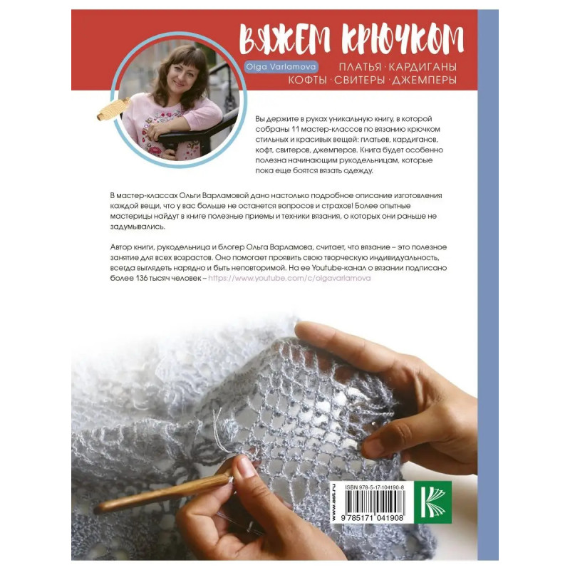 Вы держите в руках уникальную книгу, в которой собраны 11 мастер-классов по вязанию крючком стильных и красивых вещей: платьев, кардиганов, кофт, свитеров, джемперов. Книга будет особенно полезна начинающим рукодельницам, которые пока еще боятся вязать одежду. В мастер-классах Ольги Варламовой дано настолько подробное описание изготовления каждой вещи, что у вас больше не останется вопросов и страхов! Более опытные мастерицы найдут в книге полезные приемы и техники вязания, о которых они раньше не задумывались. Автор книги, рукодельница и блогер Ольга Варламова, считает, что вязание это полезное занятие для всех возрастов. Оно помогает проявить свою творческую индивидуальность и всегда выглядеть нарядно и быть неповторимой в вещах, связанных своими руками.