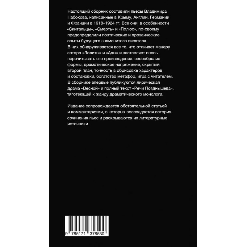 В сборнике представлены пьесы Владимира Набокова, написанные в Крыму, Англии, Германии и Франции в 19181924 гг. Все они, в особенности "Скитальцы", "Смерть" и "Полюс", посвоему предопределили поэтические и прозаические опыты будущего знаменитого писателя. В этих ранних пьесах обнаруживается все то, что отличает манеру автора "Лолиты" и "Ады" и заставляет с еще большим интересом перечитывать его произведения: своеобразие формы, драматическое напряжение, скрытый второй план, точность в обрисовке характеров и обстановки, богатство метафор. Впервые публикуются пьеса "Весной" и полный текст "Речи Позднышева", тяготеющей к жанру драматического монолога. Издание сопровождается обстоятельной статьей и комментариями, в которых воссоздаются обстоятельства сочинения пьес и раскрываются их литературные источники.