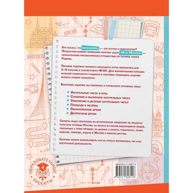 В сборнике представлены математические задачи для учащихся 56 классов, распределенные по темам курса. В каждой теме по 4 задачи разного уровня сложности, способствующие формированию функциональной грамотности учащихся. Материал пособия соответствует ФГОС и ФРП. Сюжеты задач построены на исторических сведениях об объектах культуры столицы России, о выдающихся людях, чья жизнь связана с этим городом, о спорте, транспорте, производстве, природе, отдыхе в Москве и о многом другом. Задачник можно использовать как на уроках математики, так и во внеурочной деятельности.