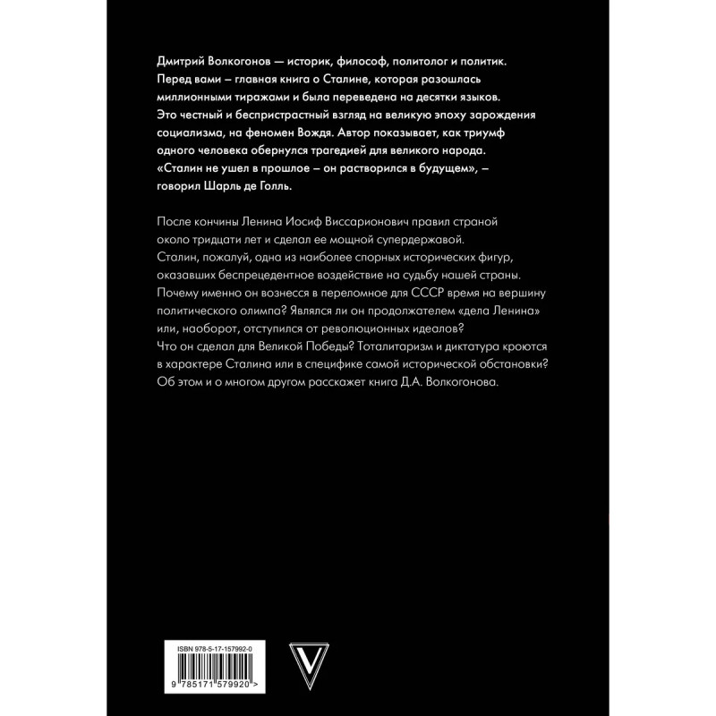 Сталин. Дмитрий Волкогонов - историк, философ, политолог и политик. Перед вами - главная книга о Сталине, которая разошлась миллионными тиражами и была переведена на десятки языков. Это честный и беспристрастный взгляд на великую эпоху зарождения социализма, на феномен Вождя. Автор показывает, как триумф одного человека обернулся трагедией для великого народа. "Сталин не ушел в прошлое - он растворился в будущем", - говорил Шарль де Голль. После кончины Ленина Иосиф Виссарионович правил страной около тридцати лет и сделал ее мощной супердержавой. Сталин, пожалуй, одна из наиболее спорных исторических фигур, оказавших беспрецедентное воздействие на судьбу нашей страны. Почему именно он вознесся в переломное для СССР время на вершину политического олимпа? Являлся ли он продолжателем "дела Ленина" или, наоборот, отступился от революционных идеалов? Что он сделал для Великой Победы? Тоталитаризм и диктатура кроются в характере Сталина или в специфике самой исторической обстановки? Об этом и о многом другом расскажет книг