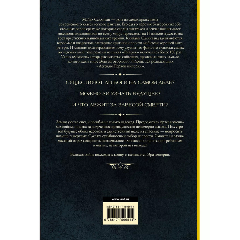 Эра смерти. Эра империи. Продолжение серии "Легенды Первой империи" от автора культового цикла "Рийрия" Майкла Салливана. Несколько тысяч лет назад, когда мир был молод, люди почитали фрэев как живых богов. Но всё изменилось после того, как человеческий род, притесняемый этими жестокими владыками мира, объявил им войну. И теперь, когда сотни кровопролитных сражений остались позади, оба народа оказались на грани гибели. И каждый из них от победы отделяет лишь один шаг