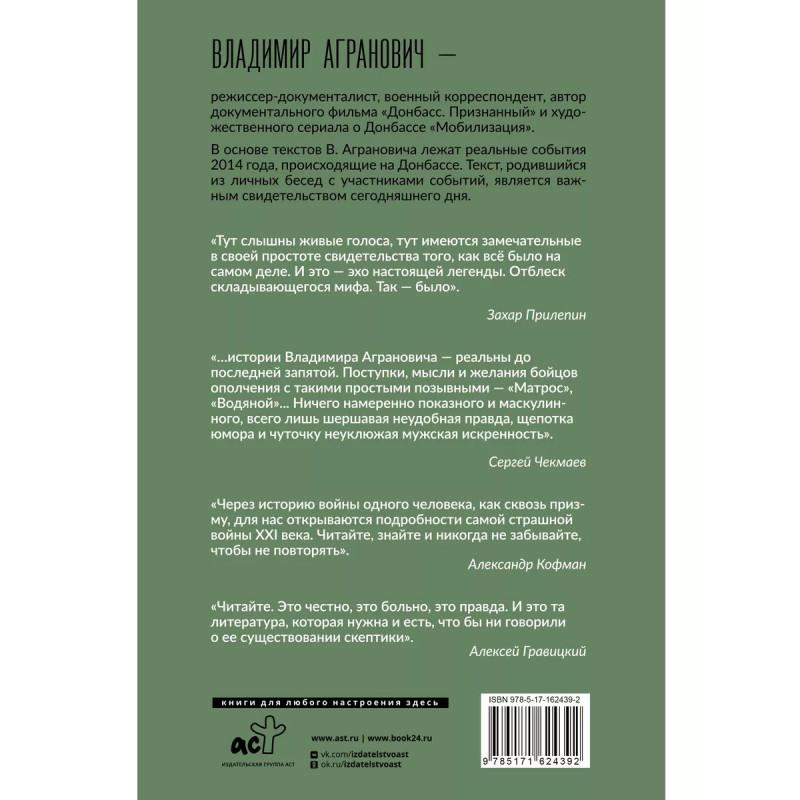 Владимир Агранович режиссер-документалист, военный корреспондент, автор документального фильма Донбасс. Признанный и художественного сериала о Донбассе Мобилизация. Текст сопровождается предисловием Германа Садулаева. В основе текстов В. Аграновича лежат реальные события 2014 года, происходящие на Донбассе. Текст, родившийся из личных бесед с участниками событий, является важным свидетельством сегодняшнего дня. Это повесть о запредельном мужестве. Отец и крестный оставили прошлую жизнь позади, чтобы совершить что-то значимое во имя общей цели. Написать эту книгу о борьбе и мужестве моих родных было моим долгом. Тут слышны живые голоса, тут имеются замечательные в своей простоте свидетельства того, как всё было на самом деле. И это эхо настоящей легенды. Отблеск складывающегося мифа. Так было. Захар Прилепин