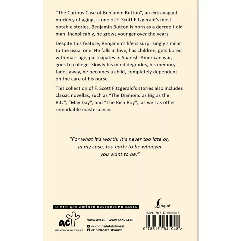 Не можете найти время, чтобы попрактиковать английский? Поучитесь тайм-мендеждменту у Бенджамина Баттона, с этим прекрасным карманным изданием! "Загадочная история Бенджамина Баттона", экстравагантная насмешка над старением, является одним из самых известных рассказов Ф. Скотта Фицджеральда. Бенджамин Баттон родился дряхлым стариком. Необъяснимо, но с годами он молодеет.Несмотря на эту особенность, жизнь Бенджамина удивительно похожа на обычную. Он влюбляется, заводит детей, ему наскучивает брак, участвует в испано-американской войне, учится в колледже. Постепенно его разум деградирует, память угасает, он становится ребенком, полностью зависимым от заботы няни. В этот сборник рассказов Ф. Скотта Фицджеральда вошли также классические новеллы, такие как "Бриллиант размером с Ритц", "Первомайский день", "Богатый мальчик", а также другие замечательные шедевры. Издание без адаптации. Наслаждайтесь талантом Ф. С. Фицджеральда в оригинале!