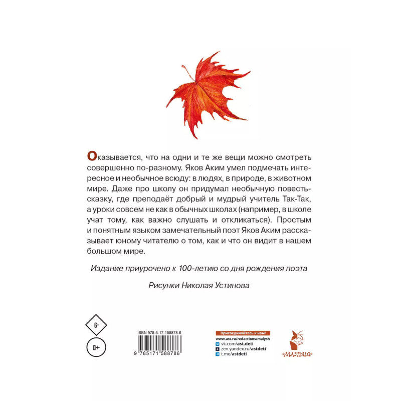 Весело мне! Стихи и сказка. Рисунки Н. Устинова. Оказывается, что на одни и те же вещи можно смотреть совершенно по-разному. Яков Аким умел подмечать интересное и необычное всюду: в людях, в природе, в животном мире. Даже про школу он придумал необычную повесть-сказку, где преподаёт добрый и мудрый учитель Так-Так, а уроки совсем не как в обычных школах (например, в школе учат тому, как важно слушать и откликаться). Простым и понятным языком замечательный поэт Яков Аким рассказывает юному читателю о том, как и что он видит в нашем большом мире. Издание приурочено к 100-летию со дня рождения поэта. Рисунки Николая Устинова.