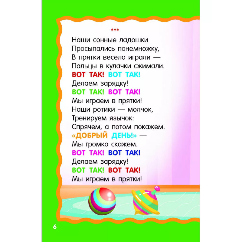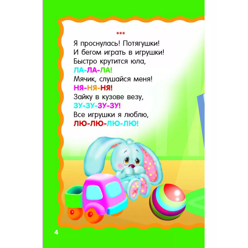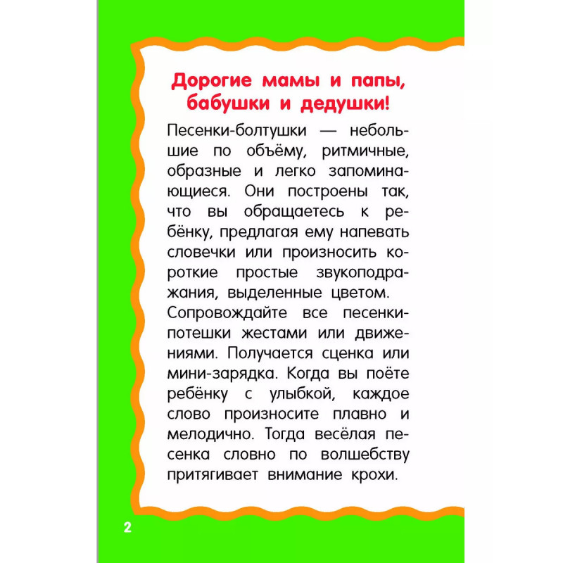Каждая книжка этой серии занимательная, полезная, красочная. Как без капризов собрать малыша на прогулку или уложить спать? На помощь заботливой маме придут песенки-болтушки добрые и мелодичные, которые деткам обязательно понравится подпевать, хлопать в ладошки, топать, прыгать, танцевать, убаюкивать куклу. Ласковый мамин голос и весёлая песенка-игралочка развеселят малыша и подарят хорошее настроение. Пусть карапуз открывает замечательную книжку и встречает новый день с улыбкой. Песенки-болтушки добрые и весёлые, небольшие по объёму, чёткие по ритму, образные и легко запоминающиеся. Чем наполнены первые песенки для малыша? Конечно, маленькими сюжетами, знакомыми звукоподражаниями и короткими словами, которые малыш с удовольствием подпоёт маме. Рифмованные диалоги построены так, что взрослый обращается к ребёнку, предлагая ему спеть одно словечко или простую фразу. Иногда строчки песенки сопровождаются жестами или движениями получается сценка или мини-зарядка. Повторять вслед за мамой слова песенки