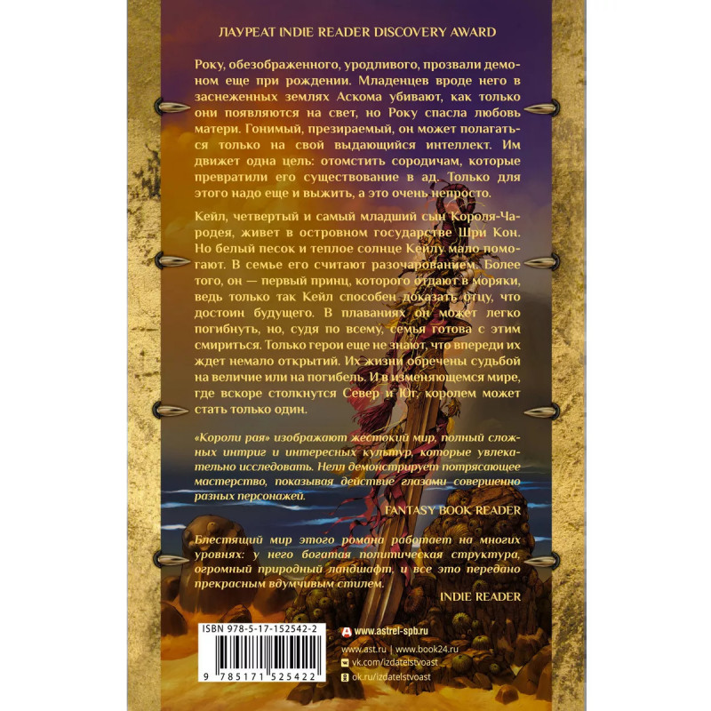 Короли рая. Впервые на русском языке. Первая книга трилогии "Пепел и песок". Для всех поклонников мрачного и реалистичного фэнтези в стиле Джорджа Мартина и Джо Аберкромби. Глубокое синее море разделяет два мира - покрытые снегом пустоши Аскома, где живут жестокие люди с суровыми законами, и королевство Шри-Кон, кажущееся раем на земле. Между Рукой и Кале пролегает целая пропасть: один родился уродливым ребёнком-демоном, чудом избежавшим смерти, другой же - младший сын Короля-Чародея, изнеженный и избалованный. Потеряв мать, Руки встаёт на путь мести, который ведёт его к войне с Шри-Кон. В это же время отец отправляет Кале на морскую службу, чтобы сделать из сына мужчину. Теперь Кале должен доказать свою ценность и отцу, и самому себе. А между тем райское королевство вот-вот столкнётся с миром жестокой снежной пустыни