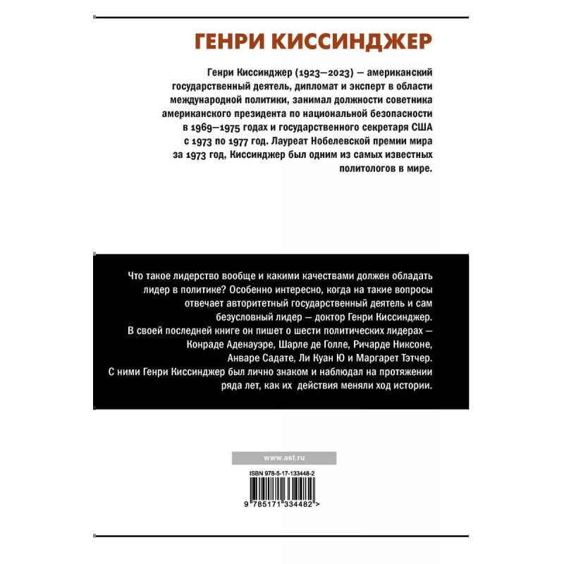 Впервые на русском языке! Новая книга Генри Киссинджера! Автор бестселлеров Дипломатия, Мировой порядок и О Китае, известный американский государственный политик и дипломат, разбирает принципы и стратегии лидерства на примере шести великих исторических фигур XX века. Мгновенный бестселлер The New York Times!