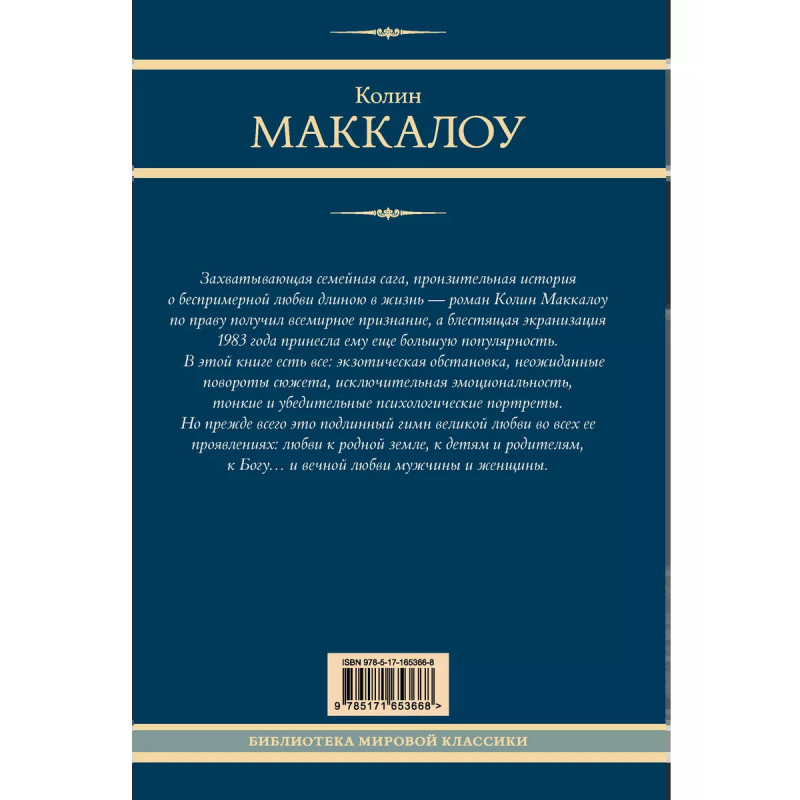 Опубликованная в 1977 году семейная сага Колин Маккалоу мгновенно стала бестселлером и до сих пор пользуется высоким спросом. Совокупный тираж романа превысил 33 миллиона экземпляров, Поющие в терновнике уверенно удерживают звание самой продаваемой книги в истории Австралии. А вышедшая в 1983 году блестящая экранизация лишь увеличила популярность романа, став вторым по рейтинговости мини-сериалом в истории американского телевидения. Действие романа разворачивается в австралийской глубинке с 1915 по 1969 годы и рассказывает историю искренней, порой запретной и недостижимой любви длиной в целую жизнь.