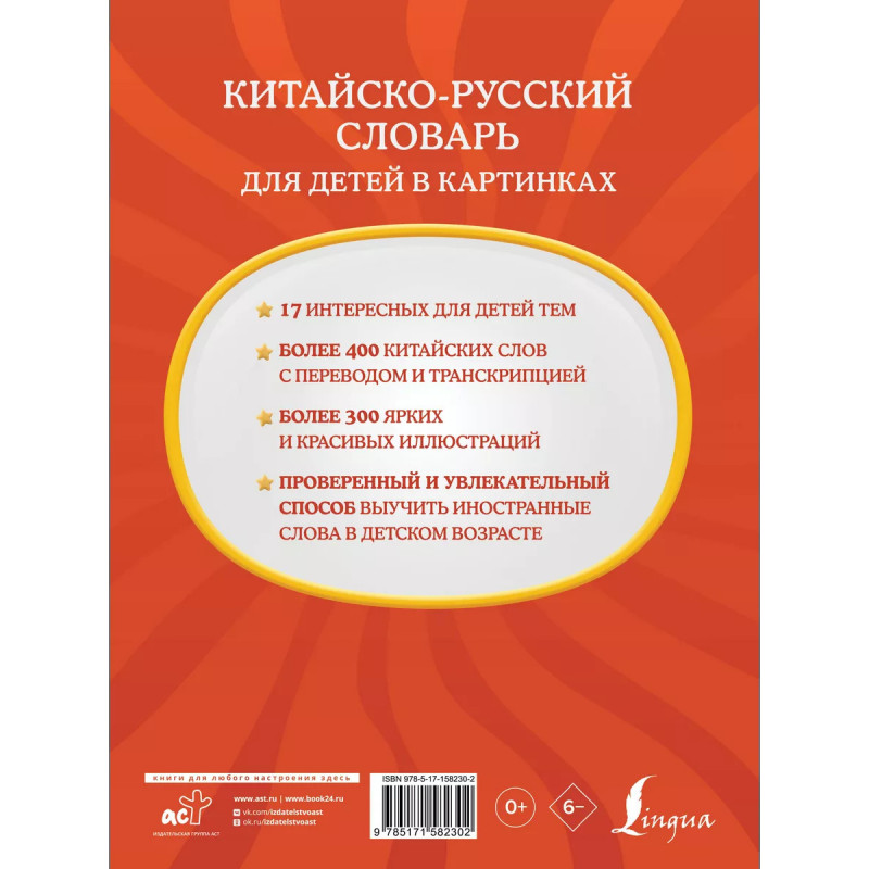 Китайско-русский словарь для детей в картинках. Книга представляет собой детский тематический словарь, в котором более 400 китайских слов, разделенных на 17 интересных для детей тем и сопровождающихся яркими и красивыми иллюстрациями, а также переводом и двумя видами транскрипции - пиньинь и русскими буквами. Словарь в картинках - проверенный и увлекательный способ выучить первые иностранные слова в детстве. Издание предназначается для детей старшего дошкольного возраста, а также для родителей и учителей.