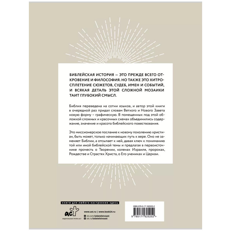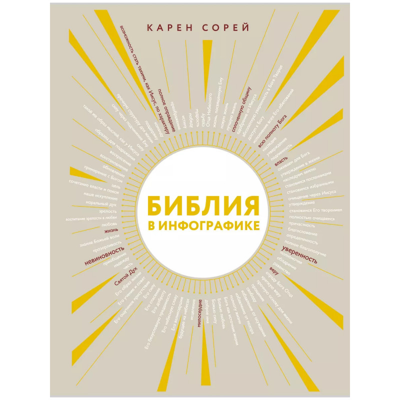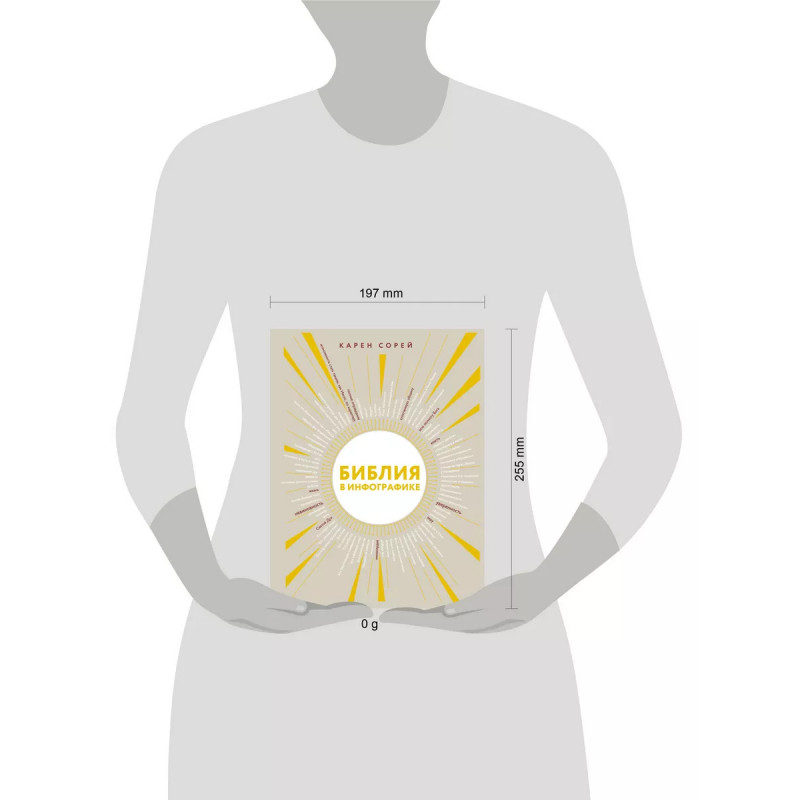 Библия в инфографике. Библейская история - это, прежде всего, откровение и философия. Но также это хитросплетение сюжетов, судеб, имен и событий, и всякая деталь этой сложной мозаики таит глубокий смысл. Библия переведена на сотни языков, и авторы этой книги в очередной раз придали словам Ветхого и Нового Заветов новую форму - графическую. В помещенных под этой обложкой сложных и красочных схемах объединились содержание, значение и красота библейского повествования. Это миссионерское послание к новому поколению христиан, быть может, только начинающих путь к вере. Оно не заменяет Библии, а отсылает к ней, давая ключ к пониманию той или иной библейской темы и предлагая в первоисточнике прочесть о Творении, коленах Израиля, пророках, Рождестве и Страстях Христа, о Его учениках и Церкви.