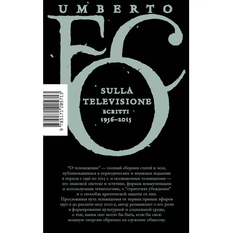 О телевидении. Эта антология работ Умберто Эко охватывает более половины столетия истории телевидения и посвящена его влиянию на все сферы общественной жизни: от культуры и искусства до политики, религии и образования. Автор тщательно анализирует язык и символические формы феномена телевидения, и рассматривает с разных сторон разнообразие методов, с помощью которых оно воздействует на людей. В сборник вошли статьи, эссе и доклады, опубликованные в период с 1956 года, когда в Италии появились первые эфиры, о которых Эко писал как сотрудник телекомпании RAI, вплоть до 2015 года, когда телевидение проиграло в гонке за внимание аудитории социальным сетям и интернету. От прямых эфиров до скандальных реалити-шоу, от Инспектора Деррика до "Большого брата" - в своих текстах Эко не только критикует классические телевизионные стратегии убеждения и популизм больших медиа, но и размышляет, как изменилась бы история телевидения, если бы оно пошло по пути служения обществу. Умберто Эко - известный итальянский ученый, медиевист, семиоло
