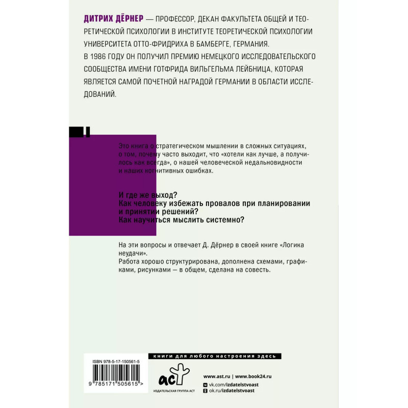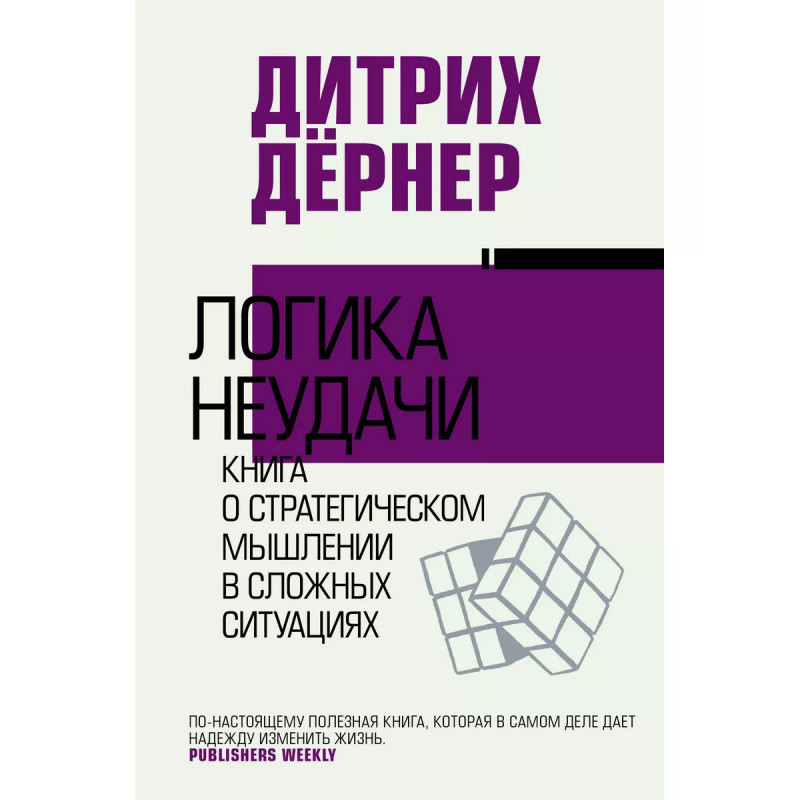 Логика неудачи. Дитрих Дёрнер - профессор, декан факультета общей и теоретической психологии в Институте теоретической психологии Университета Отто-Фридриха в Бамберге, Германия. В 1986 году он получил премию Немецкого исследовательского сообщества имени Готфрида Вильгельма Лейбница, которая является самой почетной наградой Германии в области исследований. Это книга о стратегическом мышлении в сложных ситуациях, о том, почему часто выходит, что "хотели как лучше, а получилось как всегда", о нашей человеческой недальновидности и наших когнитивных ошибках. И где же выход? Как человеку избежать провалов при планировании и принятии решений? Как научиться мыслить системно? На эти вопросы и отвечает Д. Дёрнер в своей книге "Логика неудачи". Работа хорошо структурирована, дополнена схемами, графиками, рисунками - в общем сделана на совесть.