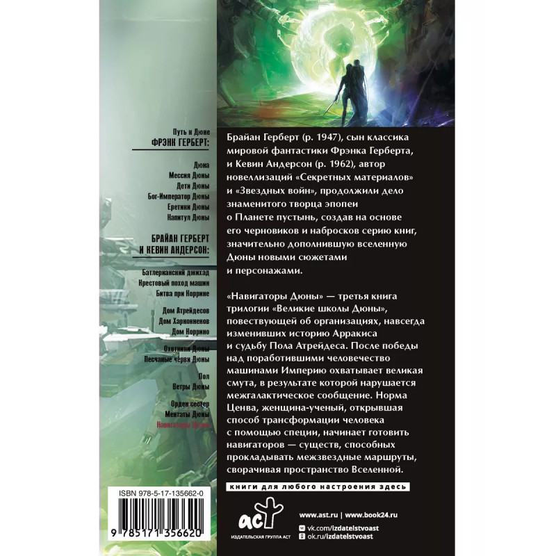 "Навигаторы Дюны" третья книга трилогии "Великие школы Дюны", повествующей об организациях, навсегда изменивших историю Арракиса и судьбу Пола Атрейдеса. После победы над поработившими человечество машинами Империю охватывает великая смута, в результате которой нарушается межгалактическое сообщение. Норма Ценва, женщина-ученый, открывшая способ трансформации человека с помощью специи, начинает готовить навигаторов существ, способных прокладывать межзвездные маршруты, сворачивая пространство Вселенной.