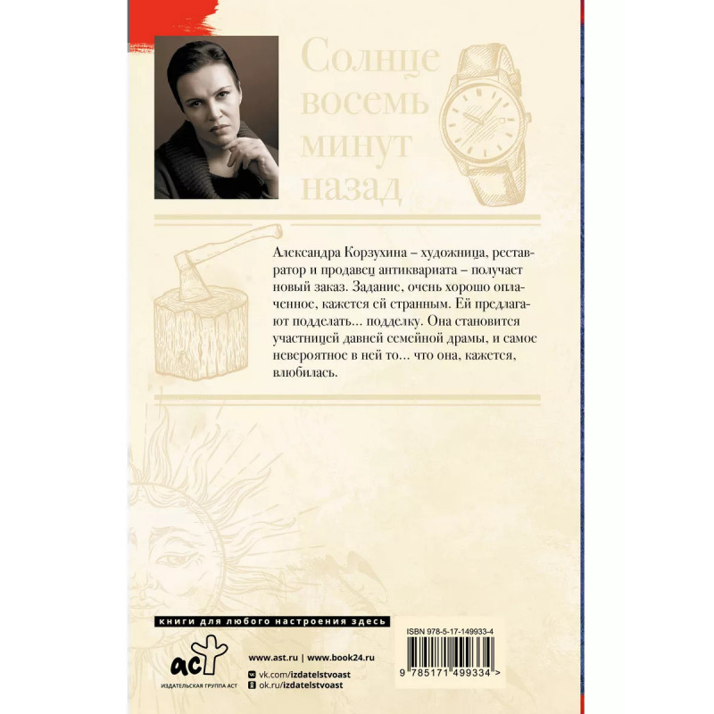 Солнце восемь минут назад. - Продолжение серии арт-детективов про художника-реставратора Александру Корзухину. - Анна Малышева - популярная писательница, работает в жанре остросюжетной прозы, детективных и историко-авантюрных романов. - Автор бестселлеров "Кукольный домик", "Черная вдова", "Железный лес". Продано более 6 000 000 книг автора! - Книги Анны Малышевой постоянно экранизируются, потому что детективная линия в её романах всегда прописана фактологически точно и кинематографично. - Вас ждут динамичный сюжет, смелая и умная главная героиня, детальные описания и загадка, не отпускающая до самого финала.