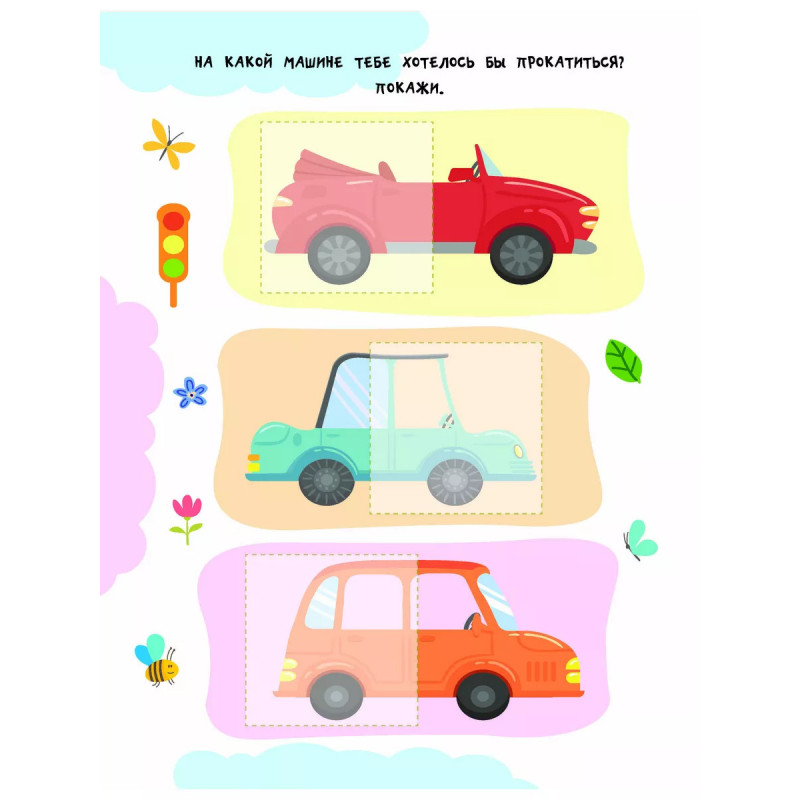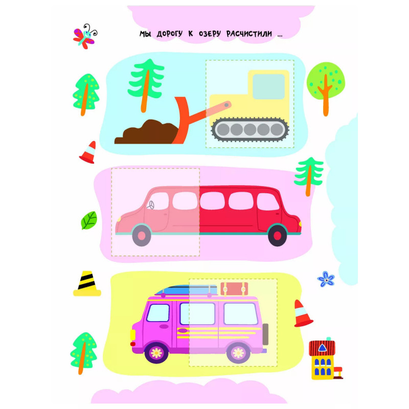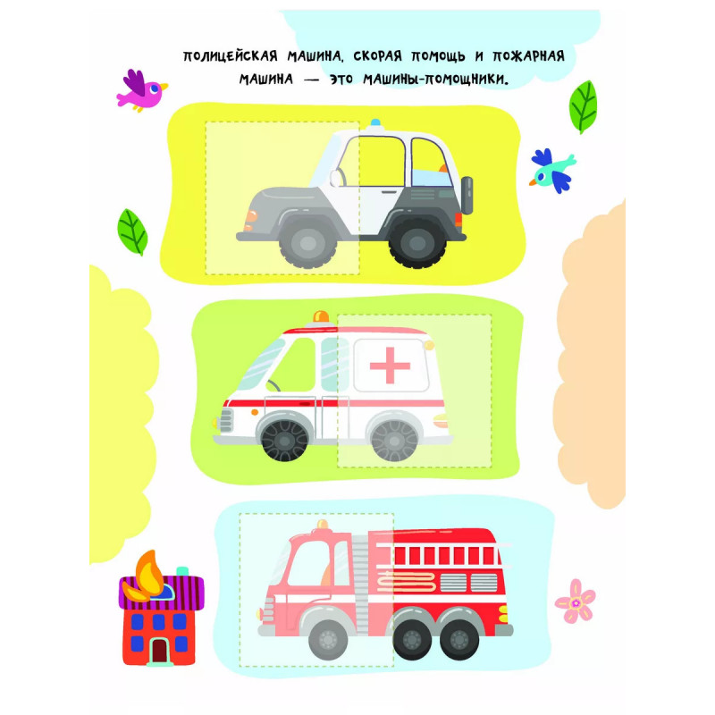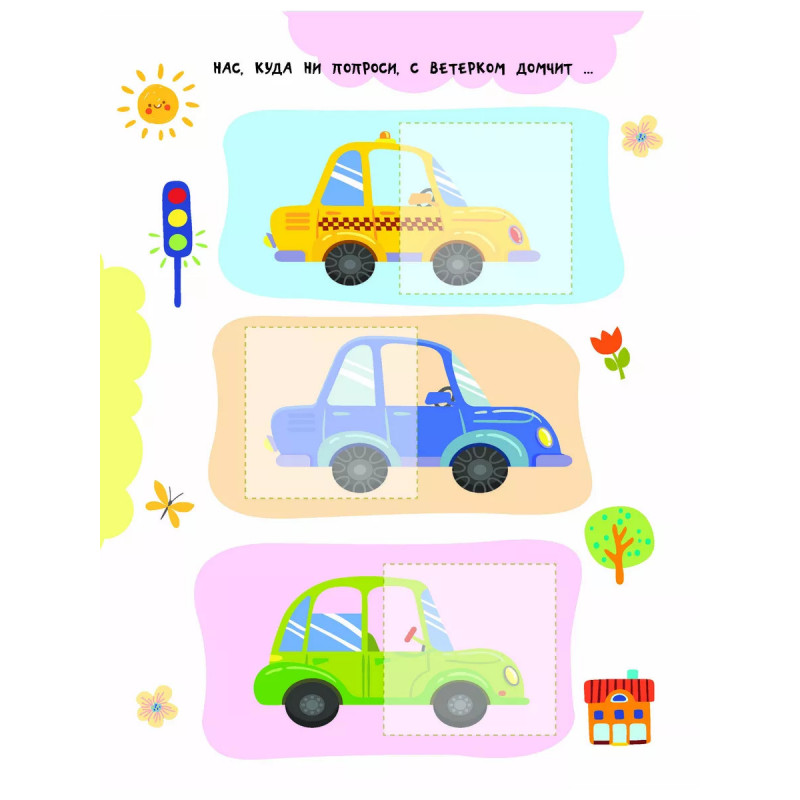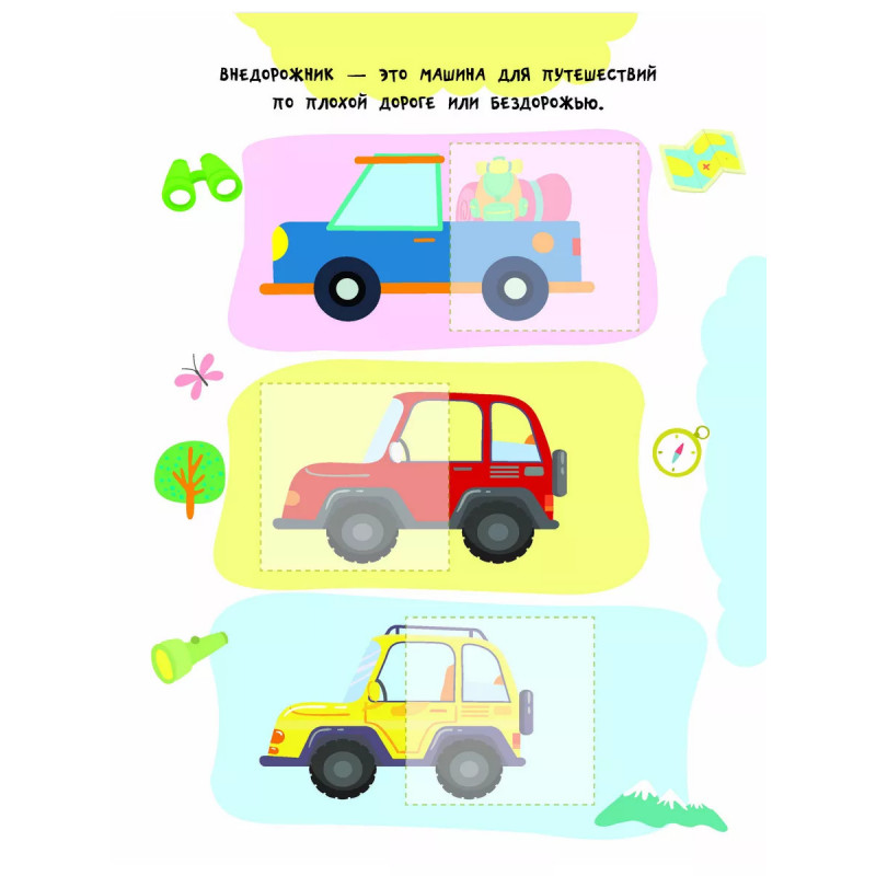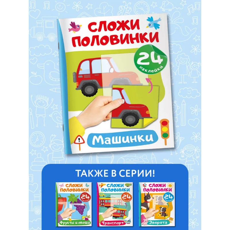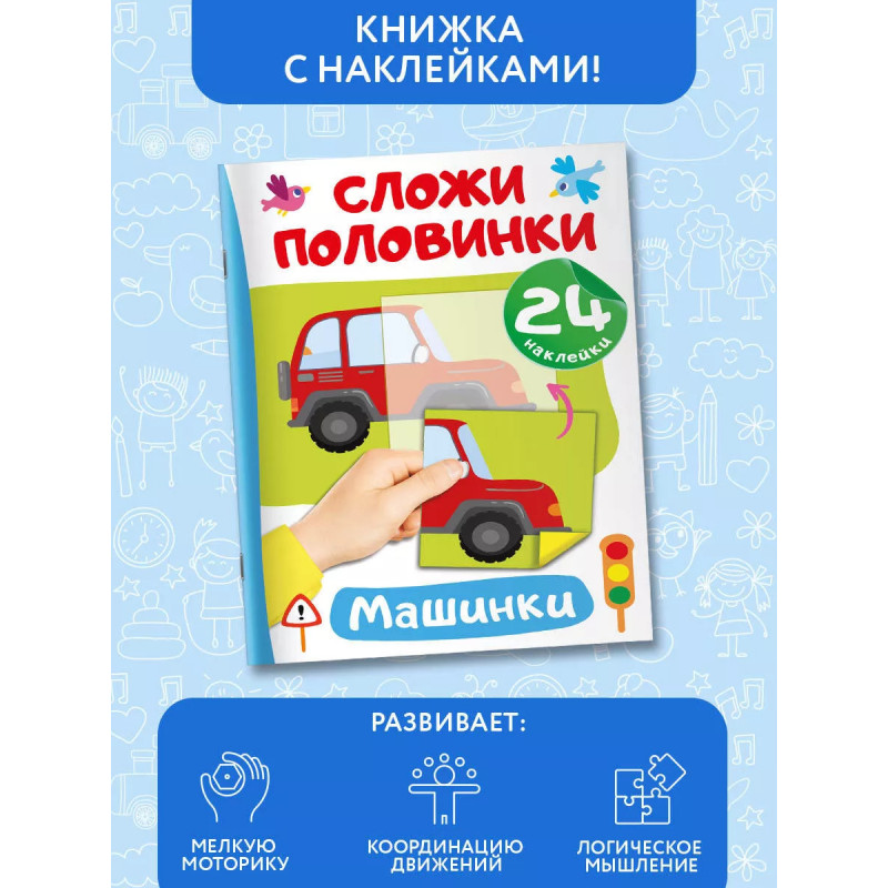 Машинки. "Невозможно развивать мелкую моторику, внимание и одновременно изучать что-то новое", - скажут родители. Но это реально, если на помощь придёт замечательная книга "Машинки". Малыш подбирает к каждой картинке подходящую наклейку-половинку, а затем аккуратно наклеивает её в нужное место. На первый взгляд кажется, что это легко. Но на самом деле ребёнок должен приложить очень много усилий! Юный ученик тренирует мелкую моторику и координацию движений - важные навыки для письма. Занимаясь, ребёнок развивает внимание, аккуратность, зрительное восприятие, память и логическое мышление. Если с первого раза не получится наклеить ровно - не беда! Ведь наклейку можно отклеить и легко повторить попытку снова. А ещё из книги малыш узнает, какие бывают машины - седаны, внедорожники, джипы и т. д. Вперёд - навстречу новым знаниям!