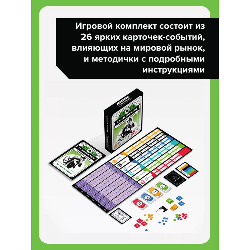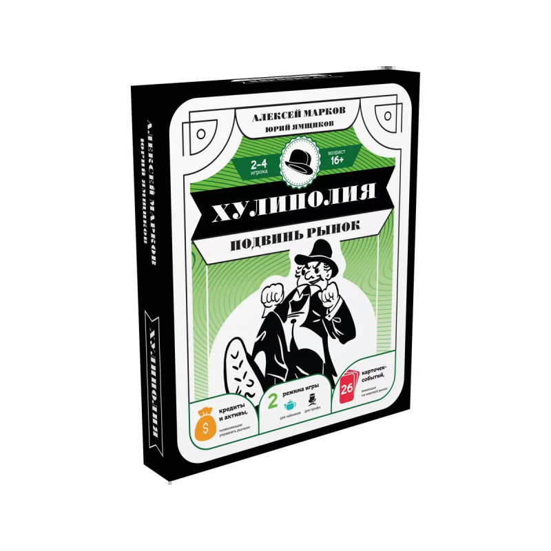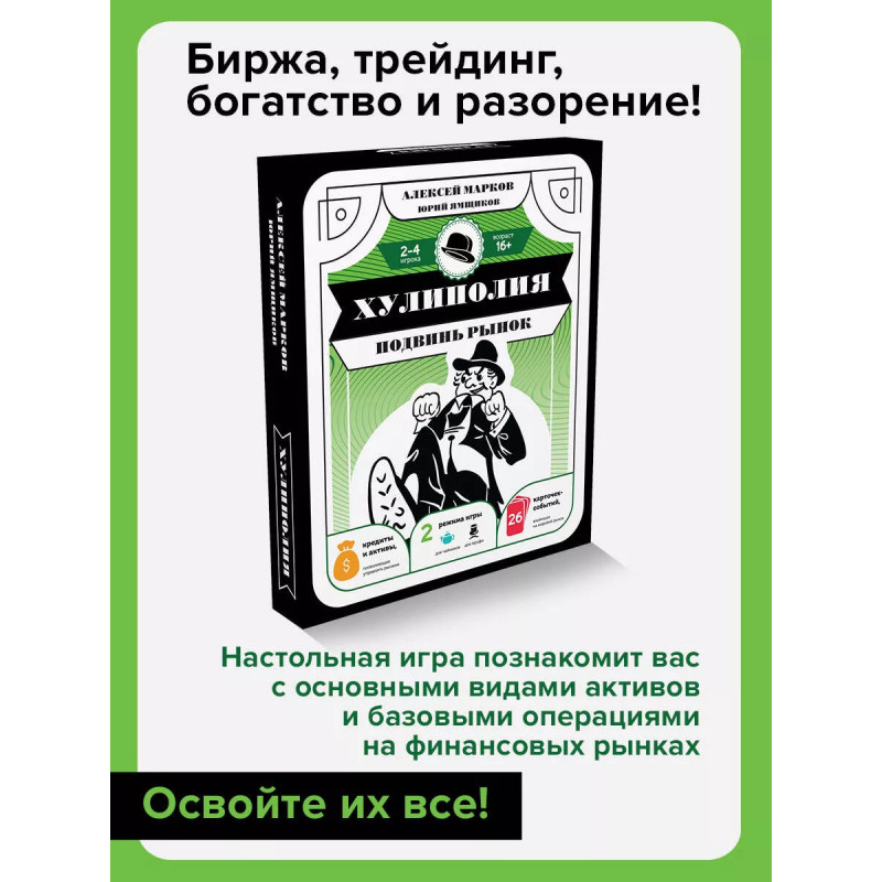 "Хулиполия: подвинь рынок" настольная игра от самого популярного автора книг по экономике Алексея Маркова! Да-да, тот самый, который "Хулиномику" написал. В "Хулиполии" вы станете финансовыми воротилами самого высокого пошиба. Настолько высокого, что сможете влиять на ценность активов не только их покупкой или продажей, но и тем, какие события в мировой политике и экономике поддержать. И всё ради прибыли, ведь выиграет тот кто заработает на всём этом больше всего денег! В игре представлены основные виды активов и базовые финансовые операции. Вы можете шортить или играть вдолгую, зарабатывать на скачка стоимости или надеяться на дивиденды вкладываться в безопасные гособлигации или мутить воду на акция развивающихся стран.