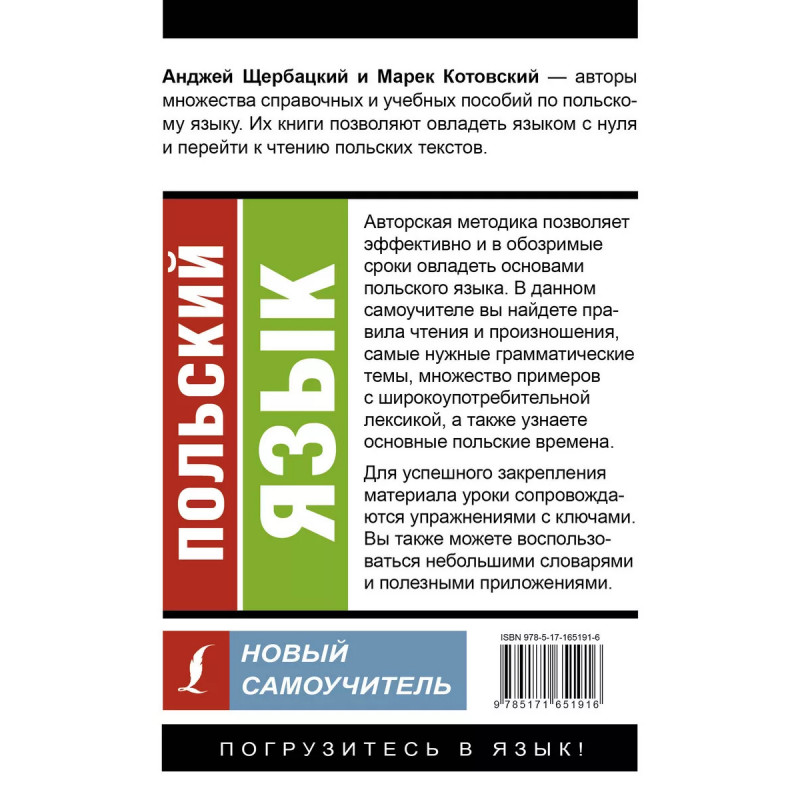 Анджей Щербацкий и Марек Котовский авторы множества справочных и учебных пособий по польскому языку. Их книги позволяют овладеть языком с нуля и перейти к чтению польских текстов. Самоучитель предназначен для всех, кто желает в короткий срок получить базовые знания польской грамматики и навыки устной и письменной речи. Книга состоит из 20 уроков, построенных по принципу от простого к сложному. В каждом уроке вы найдете наиболее употребительные разговорные фразы и упражнения с ответами. Вы также можете воспользоваться краткими словарями и полезными приложениями. Для всех, кто изучает польский язык на курсах или самостоятельно.