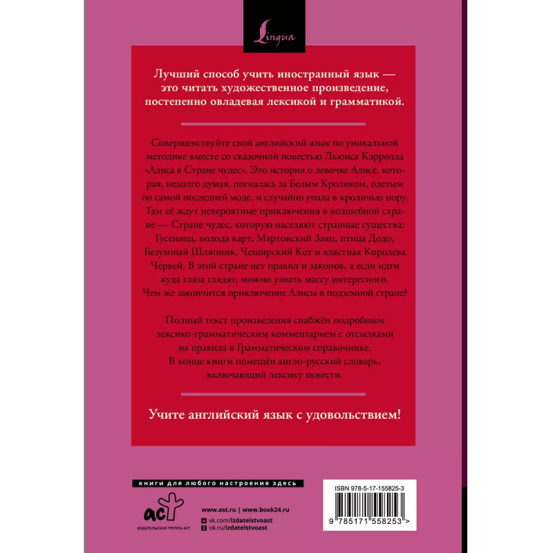 Алиса в Стране чудес Alice's Adventures in Wonderland: читаем в оригинале с комментарием. Лучший способ учить иностранный язык - это читать художественное произведение, постепенно овладевая лексикой и грамматикой. Совершенствуйте свой английский язык по уникальной методике вместе со сказочной повестью Льюиса Кэрролла "Алиса в Стране чудес". Это история о девочке Алисе, которая, недолго думая, погналась за Белым Кроликом, одетым по самой последней моде, и случайно упала в кроличью нору. Там её ждут невероятные приключения в волшебной стране - Стране чудес, которую населяют странные существа: Гусеница, колода карт, Мартовский Заяц, птица Додо, Безумный Шляпник, Чеширский Кот и властная Королева Червей. В этой стране нет правил и законов, а если идти, куда глаза глядят, можно узнать массу интересного. Чем же закончится приключение Алисы в подземной стране? Полный текст произведения снабжён подробным лексико-грамматическим комментарием с отсылками на правила в Грамматическом справочнике. В конце книги помещён англо-русский словарь, включающий лексику повести. Издание предназначено для всех, кто учит а