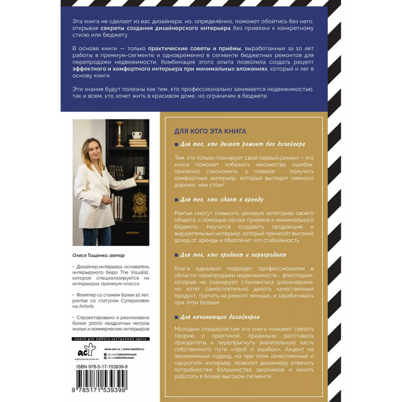 ИнтерьерChic. Руководство по созданию дизайнерского интерьера без дизайнера, проекта и большого бюдж. Книга "ИнтерьерЧик" - лучший помощник для тех, кто хочет создать дизайнерский интерьер без больших вложений. В ее основе - только практические советы и приемы, выработанные автором за годы работы в премиум-сегменте и, одновременно, в сегменте бюджетных ремонтов для перепродажи недвижимости. Комбинация этого опыта позволила Олесе Тищенко создать уникальный рецепт интерьера, который выглядит намного дороже, чем стоит.