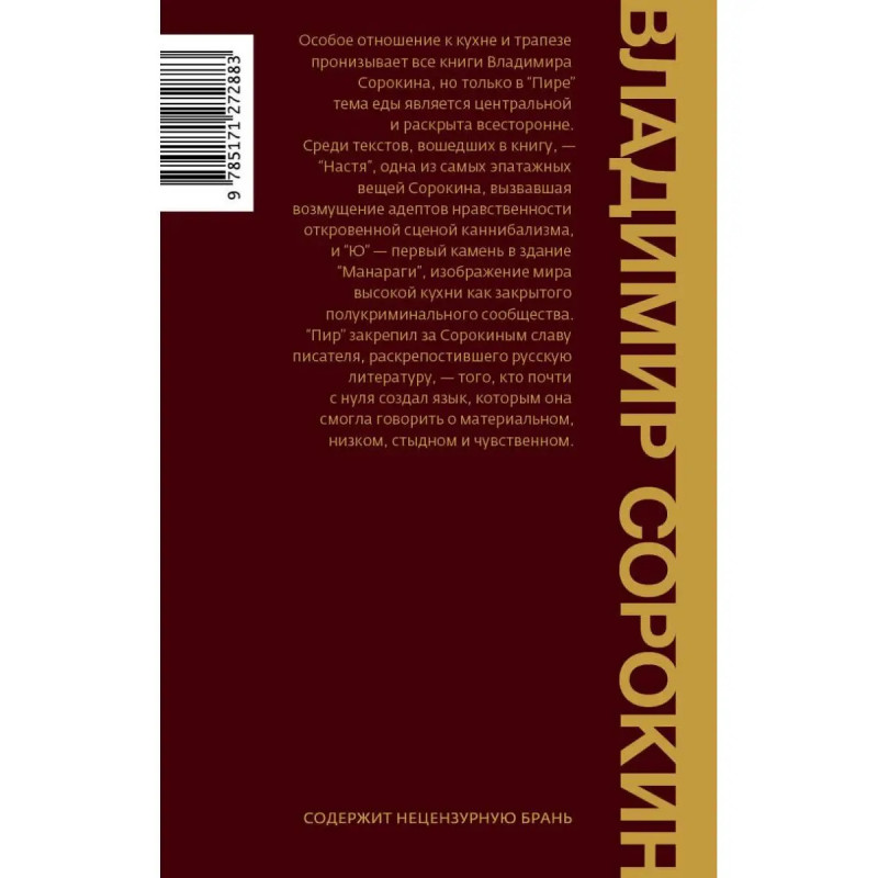 В серии Весь Сорокин выходит легендарный сборник рассказов Пир, книга, сплетающая в одно яркое и невероятное полотно высокое и низменное, реальность и вымысел, классическую русскую литературу и советские клише. Главной темой этого сборника из тринадцати рассказов стала еда, еда во всех смыслах и во всех проявлениях. В эпоху постмодернизма и массового потребления едой становится и классическая культура, и язык советской пропаганды, и светлые чаяния русской интеллигенции начала XX века, и японские представления о красоте, и сам человек и даже пустота, которую, оказывается, можно поглощать ложками. Всё это может съедено и переварено. Некоторые из этих рассказов шокируют, некоторые заставляют серьезно задуматься, некоторые гомерически рассмеяться, некоторые поражают своей актуальностью и так резонируют с происходящим в России и в мире, словно они были написаны только вчера. Здесь каждый найдет для себя то, что он ищет в современной литературе: будь то символистский подтекст, философские размышления, социальну