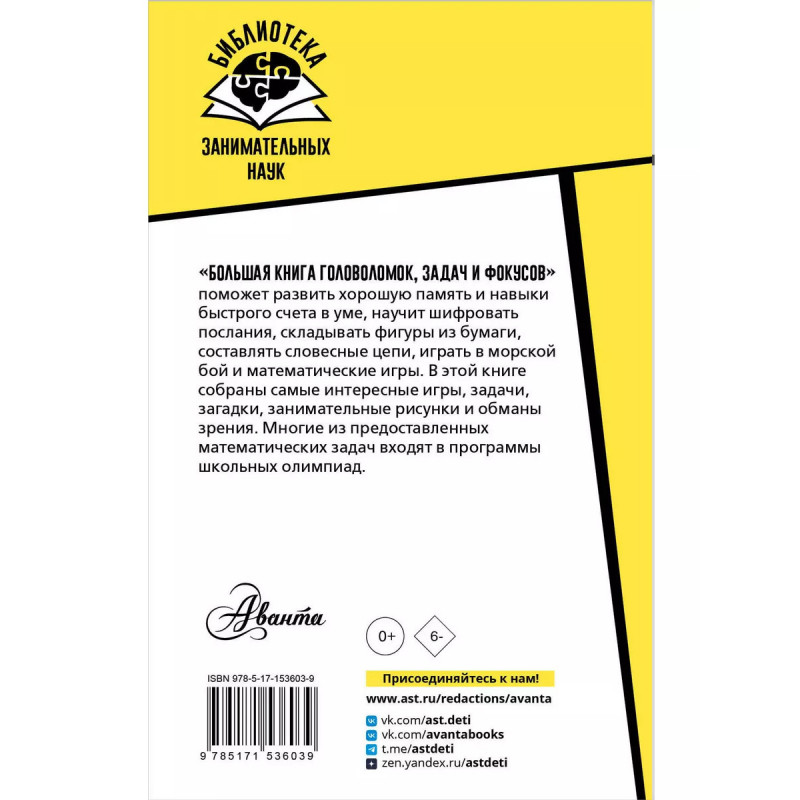 С "Большой книгой головоломок, задач и фокусов" Якова Перельмана читатель точно не соскучится: здесь собраны самые интересные игры, загадки, головоломки, фокусы, задачи, занимательные рисунки и обманы зрения. Многие из предоставленных математических задач входят в программы школьных олимпиад и не теряют актуальности по сей день. Эта книга поможет развить хорошую память и навыки быстрого счета в уме, научит шифровать послания, складывать фигуры из бумаги, составлять словесные цепи, играть в морской бой и математические игры. Для среднего школьного возраста.