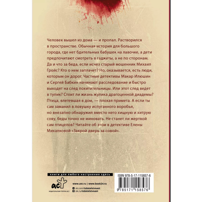 Закрой дверь за совой. Человек вышел из дома - и пропал. Растворился в пространстве. Обычная история для большого города, где нет бдительных бабушек на лавочке, а дети предпочитают смотреть в гаджеты, а не по сторонам. Да и что за беда, если исчез старый мошенник Михаил Гройс? Кто о нем заплачет? Но, оказывается, есть люди, которым он дорог. Частные детективы Макар Илюшин и Сергей Бабкин начинают расследование и быстро выходят на след похитительницы. Или этот след ведет в тупик? Стоит ли жизнь жулика драгоценной диадемы? Птица, влетевшая в дом, - пл.оxая примета. А если ты сам заманил в ловушку испуганного воробья, но внезапно обнаружил вместо него хищную и хитрую сову, беды точно не миновать. Не станет ли жертвой сам птицелов? Читайте об этом в детективе Елены Михалковой "Закрой дверь за совой".