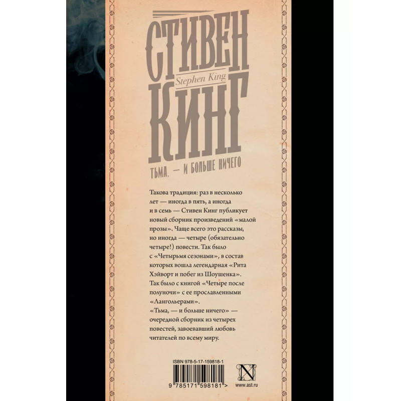 Тьма, - и больше ничего. Стивен Кинг любит баловать своих фанатов сборниками произведений "малой прозы". "Тьма, - и больше ничего" - очередной сборник из (традиционно) четырех повестей, выпущенный в 2010 году и неоднократно переиздаваемый, три из четырех произведений сборника экранизированы. Подарочное издание в стильном оформлении Андрея Фереза.