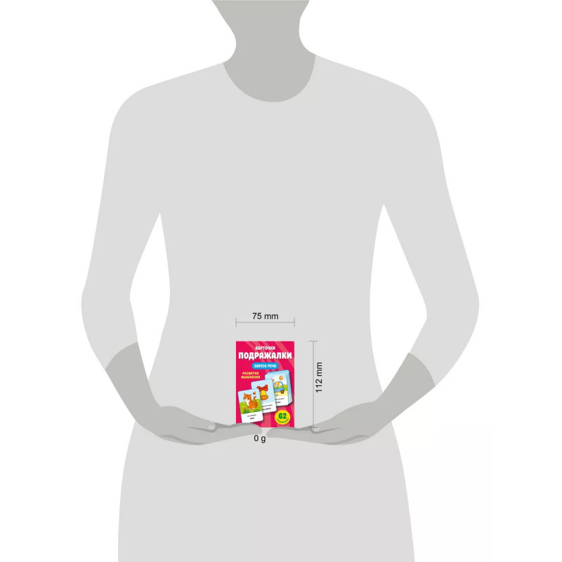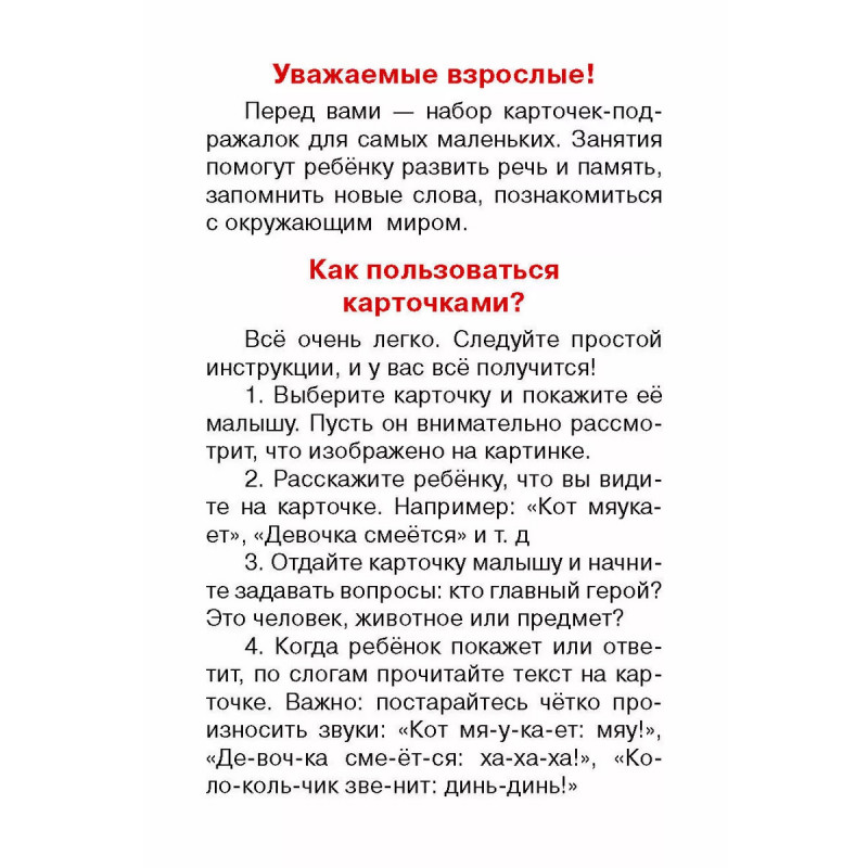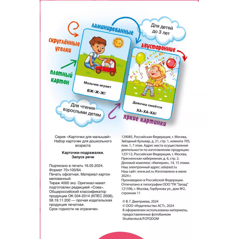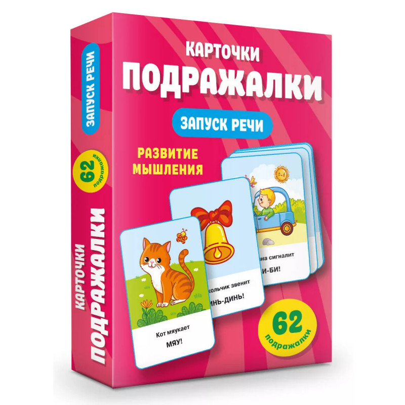 Подражалки. Карточки для запуска речи. 02 года это комплект развивающих карточек для детей-дошкольников. В комплекте 64 разрезные карточки с красочными изображениями предметов и животных. Под каждым предметом легко читаемая подпись с названием и тем звуком, который может издавать предмет. Родитель показывает ребёнку карточку, читает вслух название предмета и звукоподражание. Затем взрослый просит ребёнка повторить название и звук. Так ребёнок знакомится с названиями предметом и их свойствами, а заодно развивает речь, учится чётко и разборчиво проговаривать буквы, слова и фразы. Карточки продаются в удобной для хранения коробке.