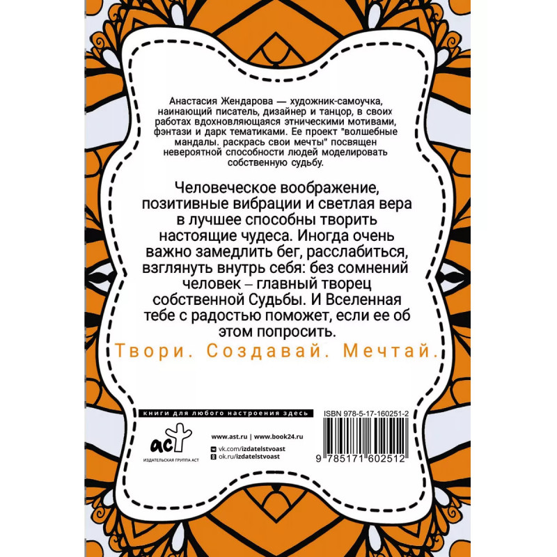 Волшебные Мандалы. Раскрась свои мечты. Человеческое воображение, позитивные вибрации и светлая вера в лучшее способны творить настоящие чудеса. Иногда очень важно замедлить бег, расслабиться, взглянуть внутрь себя: без всяких сомнений, человек - главный творец собственной судьбы. И Вселенная с радостью поможет в этом, если ее об этом правильно попросить. Волшебные Мандалы помогут вам настроиться на нужный лад и ощутить гармонию с собой и Вселенной