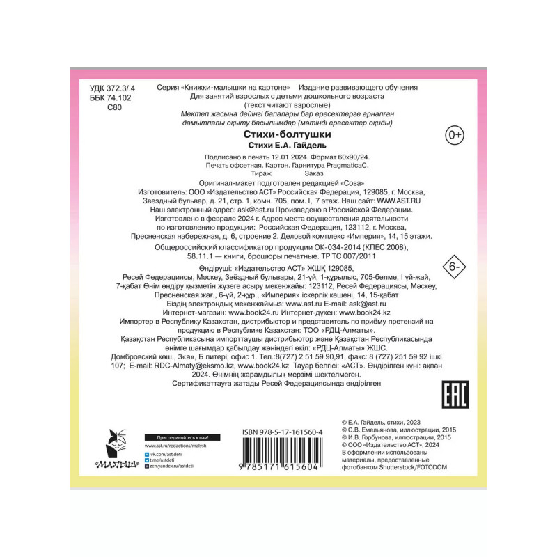 Каждая книжка этой серии - занимательная, полезная, красочная. Как без капризов собрать малыша на прогулку или уложить спать? На помощь заботливой маме придут стихи-болтушки - добрые и мелодичные четверостишия, которые утром помогут ребёнку проснуться с улыбкой, а вечером успокоят и убаюкают маленького непоседу. Ласковый мамин голос и весёлая песенка-игралочка развеселят малыша и подарят хорошее настроение. Пусть карапуз открывает замечательную книжку - и встречает новый день с улыбкой. Болтушки - добрые стихи и песенки, небольшие по объёму, чёткие по ритму, образные и легко запоминающиеся. Рифмованные диалоги построены так, что взрослый обращается к ребёнку, предлагая ему досказать словечко или произнести короткие простые фразы. Повторять вслед за мамой рифмованные строчки так здорово - это доставляет малышам радость и приносит огромную пользу. Ребёнок чисто выговаривает звуки, чётко и с выражением произносит каждое слово. Замечательные стихи обязательно понравятся дошколятам, помогут им вырасти добрыми и лю