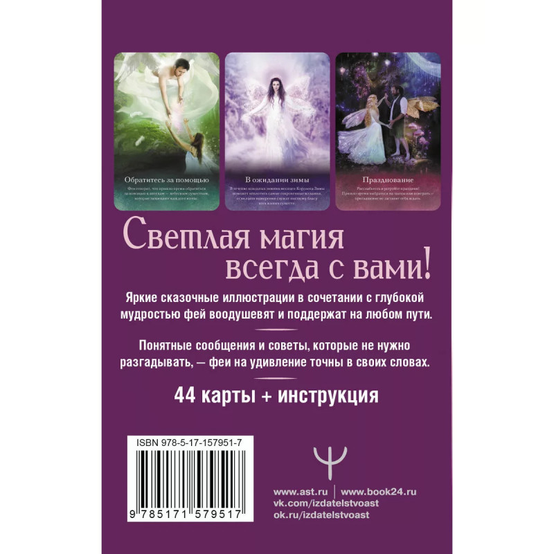 Оракул тайной магии Волшебного леса. Послания, которые помогут в любой ситуации. Оракул, созданный Карен Кей, известной "Повелительницей фей", поможет вам найти волшебную мудрость и получить конкретные ответы на вопросы по любой теме. Каждая карта наполнена позитивной, волшебной и уникальной энергией древних магических созданий. Фэйри редко выходят пообщаться с людьми, но благодаря Карен, которая работала как медиум, создавая эту колоду, вы сможете соприкоснуться с их светлой магией напрямую. Эта колода идеальна для людей, которые знают, что в жизни есть нечто большее, чем то, что можно увидеть глазами. Для тех, кто любит планету и заботится о ней, а также испытывает страсть к целительным энергиям и Зеленой магии. В колоде 44 карты и брошюра-инструкция, они упакованы в удобную коробку под размер карт.