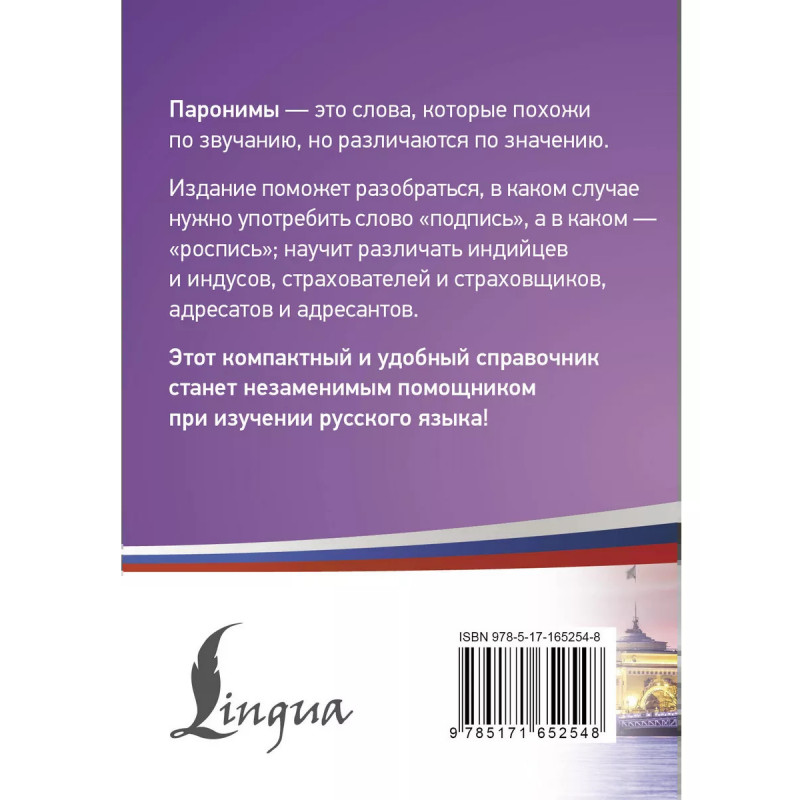 Паронимы это слова, которые похожи по звучанию, но различаются по значению. Данный справочник содержит 300 паронимов, которые часто вызывают трудности при употреблении в речи. Издание поможет разобраться, в каком случае нужно использовать слово "подпись", а в каком "роспись"; научит различать индийцев и индусов, страхователей и страховщиков, адресатов и адресантов. Для удобства в каждом слове проставлено ударение. Книга пригодится всем, кто хочет совершенствовать свою грамотность.