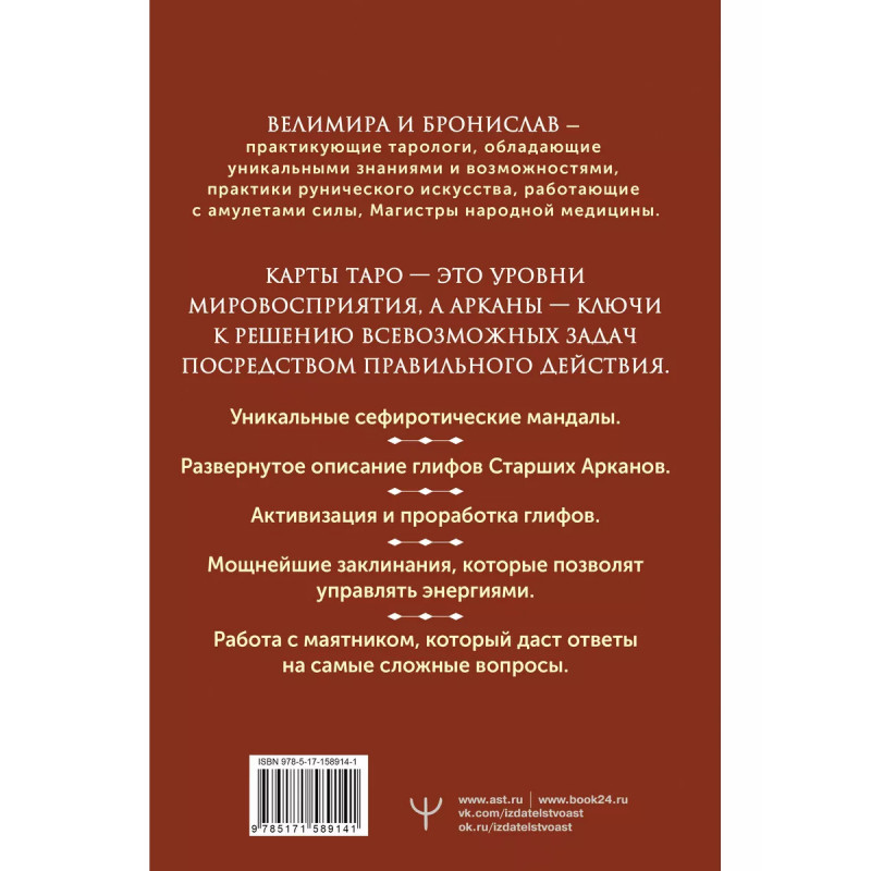 Энциклопедия магии Сефирот. Заклинания, мандалы и Старшие Арканы Таро. Велимира и Бронислав - практикующие тарологи, обладающие уникальными знаниями и возможностями, практики рунического искусства, работающие с амулетами силы, Магистры народной медицины. Корни магии Сефирот уходят на тысячелетия в прошлое, в магию Древнего Египта, к богу мудрости Тоту. Магия - это не уход от реальности, не иллюзии и фантазии. Магия Сефирот - это включение в реальность, изучение ее и работа с ней. Это взаимодействие с Сознанием Планеты, познание его законов. Карты Таро - это уровни мировосприятия, а Арканы - ключи к решению всевозможных задач посредством правильного действия. Любая жизненная ситуация выражается каким-то Арканом, то есть теми процессами и состояниями, которые описывает Аркан в Сознании Планеты. Книга предоставляет ориентир, какой Аркан необходимо применять для входа в нужное состояние относительно любой жизненной ситуации. " Уникальные сефиротические мандалы. " Развернутое описание глифов Старших Арканов. " Активизация и проработка глифов. " Мощнейшие заклинания, которые позволят