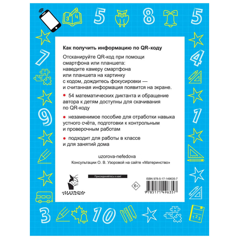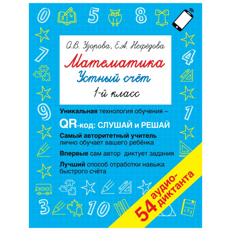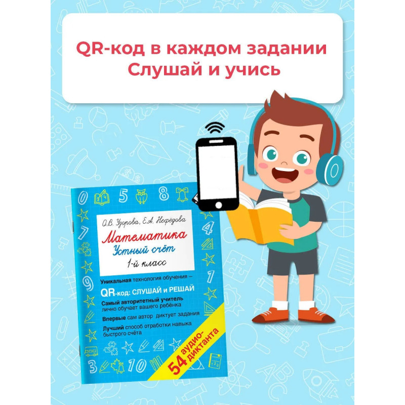 В школьном курсе есть важные темы, которые ученик не может освоить самостоятельно, и ему обязательно нужно живое общение с учителем. И это порой становится проблемой. Благодаря этой книге с QR-кодами личным репетитором вашего ребёнка станет О.В. Узорова один из самых авторитетных авторов учебных пособий. Наведите камеру на QR-код, и сама Ольга Васильевна продиктует ребёнку задания. Причём продиктует с нужной скоростью, которая учитывает возраст ученика, и во время паузы ученик успеет записать ответ. В диктантах учтено всё и время необходимое для решения примера, и время на запись ответа.Занимаясь по этой книге, содержащей 54 диктанта, ребёнок прочно освоит все базовые темы устного счёта за 1 класс, научится быстро и правильно применять нужные алгоритмы.Объём вошедших в пособие заданий и разнообразие их формулировок позволят ребёнку самостоятельно отработать навык устного счёта до автоматизма. Благодаря QR-кодам учиться будет легко и удобно!