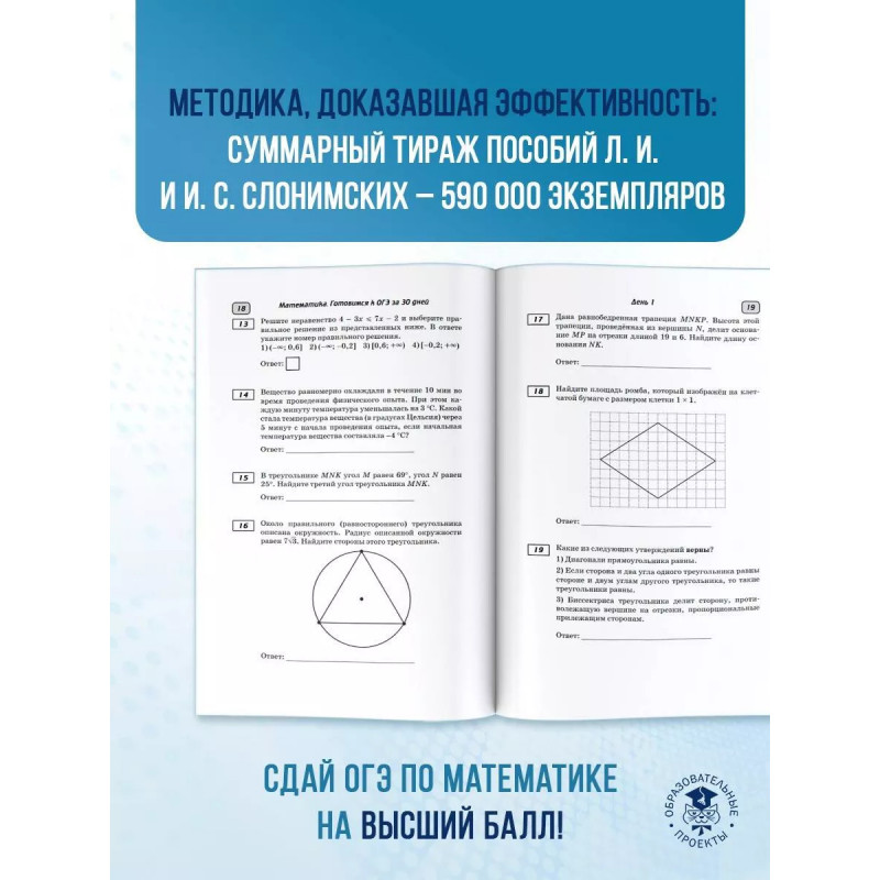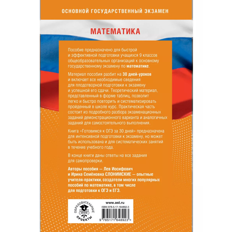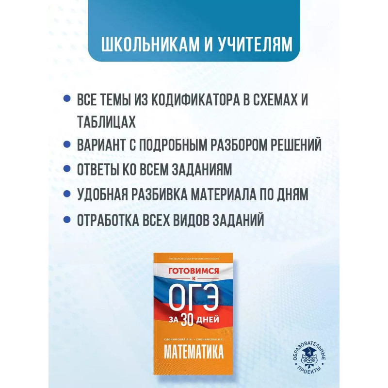 Пособие предназначено для быстрой и эффективной подготовки учащихся 9 классов общеобразовательных организаций к основному государственному экзамену по математике. Материал пособия разбит на 30 дней-уроков, включающий все необходимые сведения для плодотворной подготовки к экзамену и успешной его сдаче. Теоретический материал, представленный в форме таблиц, позволит легко и быстро повторить и систематизировать пройденный в школе курс. Практическая часть состоит из подробного разбора экзаменационных заданий демонстрационного варианта и аналогичных заданий для самостоятельного выполнения. Книга "Готовимся к ОГЭ за 30 дней" предназначена для интенсивной подготовки к экзамену, но может быть использована и для систематических занятий в течение учебного года. В конце книги даны ответы на все задания для самопроверки. Авторы пособия Лев Иосифович и Ирина Семёновна Слонимские опытные учителя-практики, создатели многих популярных пособий по математике, в том числе для подготовки к ОГЭ и ЕГЭ.