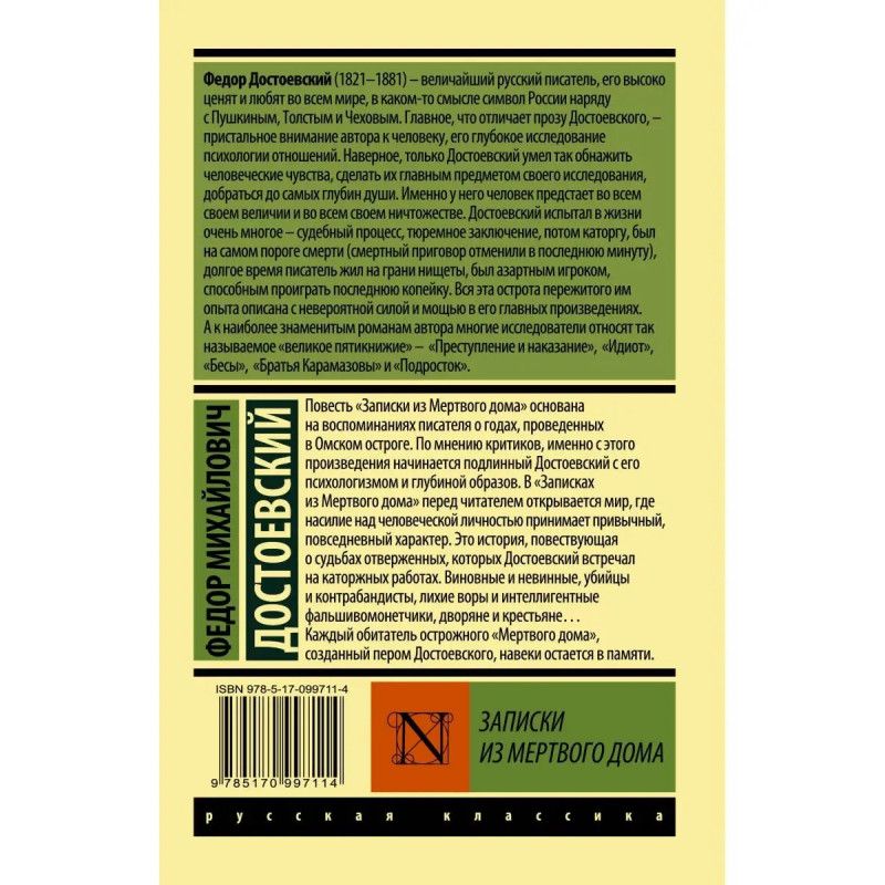 Повесть "Записки из Мертвого дома" основана на воспоминаниях писателя о годах, проведенных в Омском остроге. По мнению критиков, именно с этого произведения начинается подлинный Достоевский с его психологизмом и глубиной образов. В "Записках из Мертвого дома" перед читателем открывается мир, где насилие над человеческой личностью принимает привычный, повседневный характер. Это история, повествующая о судьбах отверженных, которых Достоевский встречал на каторжных работах. Виновные и невинные, убийцы и контрабандисты, лихие воры и интеллигентные фальшивомонетчики, дворяне и крестьяне Каждый обитатель острожного "Мертвого дома", созданный пером Достоевского, навеки остается в памяти.