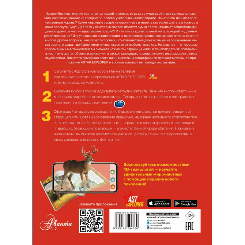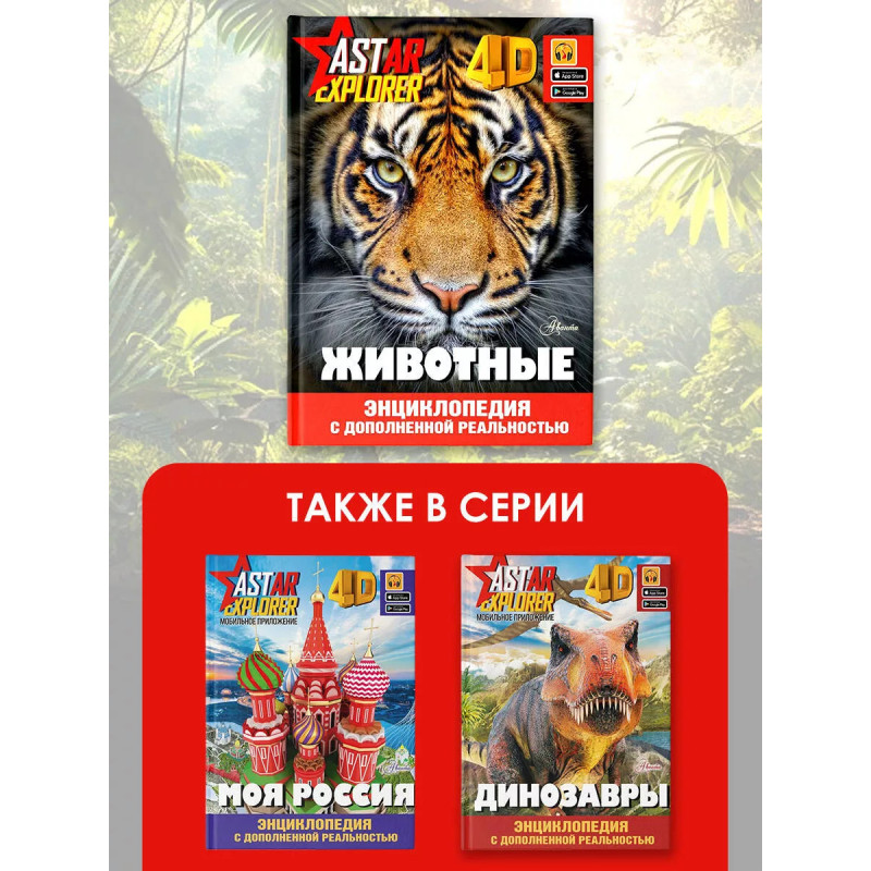 В этой большой энциклопедии представлены животные, обитающие в самых разных уголках нашей планеты. Это, например, медведи и лени, слоны и носороги, бегемоты и бородавочники, жирафы и зебры, пауки и скорпионы, скаты и пираньи, акулы и киты и даже исчезнувшие динозавры. Многие животные наверняка тебе уже знакомы, но в этом издании ты встретишь таких, о которых, возможно, ни разу и не слышал. И самое главное - некоторых из них ты сможешь увидеть в объеме и движении, ведь это не обычная книга, а энциклопедия, выполненная в формате интерактивных 3D-игр! Узнавай больше о животном мире нашей планеты, используя небывалые возможности дополненной реальности, - это не только полезно, но и очень интересно! Для младшего школьного возраста.