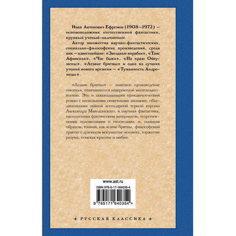 "Лезвие бритвы" знаковое произведение писателя, отличающееся невероятной многоплановостью. Это и захватывающий приключенческий роман с несколькими сюжетными линиями, объединенными тайной легендарной черной короны Александра Македонского, и научная фантастика, наполненная фактическим материалом, теоретическими положениями и гипотезами и, главным образом, тонкий, как лезвие бритвы, философский трактат о духовном могуществе человека, торжестве разума, поисках красоты и любви.
